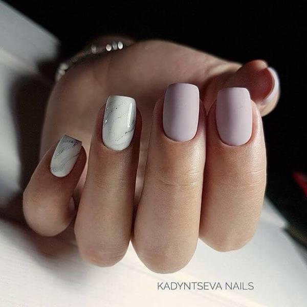 Las texturas mates y de mármol dan un toque natural a este diseño. El sutil jaspeado acentúa dos dedos, mientras que un color malva pálido y mate de las uñas cubre los otros. Este diseño es tan discreto, que puede ser usado incluso por personas que normalmente no disfrutan de usar el arte de las uñas. Es fácil de llevar en casa.