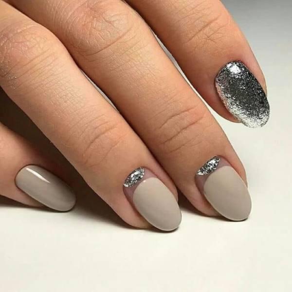 El pulido rosa mate desnudo contrasta con la plata brillante. El tono más oscuro de la plata da profundidad al diseño. En el dedo anular, el artista ha pintado un diseño triangular, dando un giro único al concepto de la manicura francesa. Este diseño presenta una actualización de la clásica uña rosa mate desnuda.