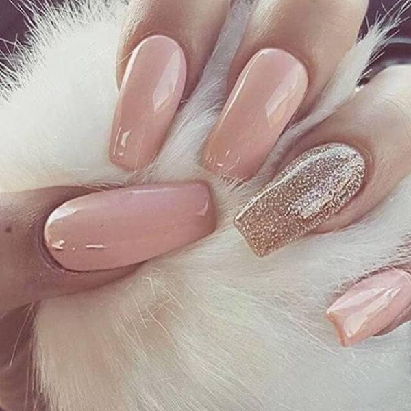 Este diseño de uñas largas combina el clásico color rosa con un moderno brillo de oro rosa. Este es un diseño simple y sutil y una gran manera de llevar el glamour a cualquier ocasión especial. Todo el mundo puede usar esta combinación de colores. Pruébalo con diferentes colores para darle tu propio giro a esta simple idea de diseño.