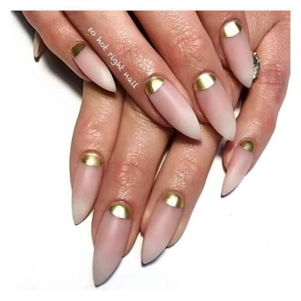 Estas uñas rosadas y doradas se usan largas y puntiagudas para un efecto dramático. Los diferentes tipos de manicura son buenos para diferentes ocasiones. Esta es una toma del diseño de las uñas francesas. Estas uñas tienen acentos de cromo dorado brillante en la media luna para un toque de glamour. Estas uñas complementan muy bien la brillante joyería de oro y diamantes.