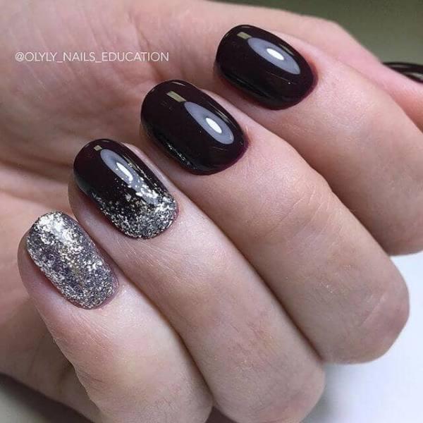 30) Uñas de color púrpura profundo y acentos de brillo de Chevron