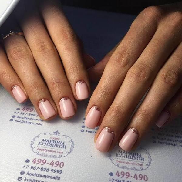 Este diseño de arte de uñas atemporal se ve muy bien en todo el mundo. Combina una manicura francesa de color rosa pálido con puntas cuadradas. Para variar, puedes cambiar el color rosa pálido por otro bonito color pastel. Estas uñas son tan fáciles de llevar, que cualquiera querría tenerlas. Estas uñas sutilmente brillantes te ayudarán a verte mejor en cualquier situación.