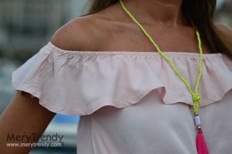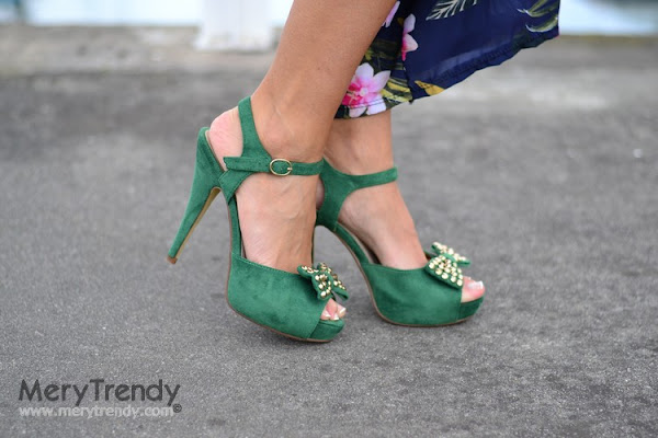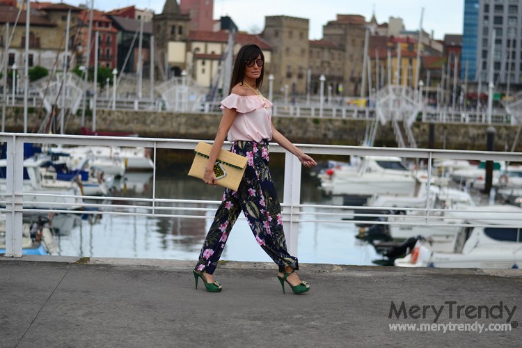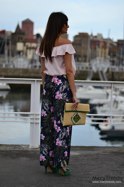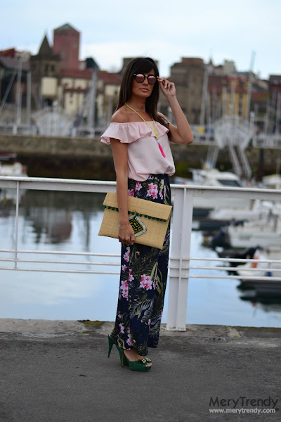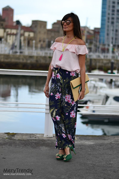 Para que veáis lo que puede cundir aquí un presupuesto de 50 Euros, os dejo unas cuantas imágenes de este outfit tan veraniego compuesto por una blusa de escote barco con volantes de 11,99 Euros, un pantalón recto fluido estampado de 13,99 Euros (ambos de súper tendencia esta temporada) y unas sandalias de tacón de 22,99 Euros (tipo peep toe) con cierre de pulsera ajustable al tobillo y plataforma delantera, en color verde (una tonalidad realmente apetecible), con detalle de lazo, que me parecieron ideales para darle un aire glauroso a este day-look de verano. Y ya, para completarlo, nada mejor que un llamativo colgante con borla y unos pendientes (ya más discretitos, eso sí... jijiji).