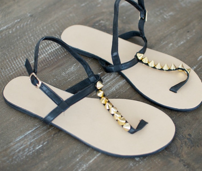Si tenemos unas sandalias con tiras finas a las que queremos renovar su estética, esta idea de A pair and a spare es la ideal. Si tenemos una maquina remachadora de tachuelas podemos colocarlas nosotros mismos, pero si no es así, esta labor la puede realizar el zapatero.