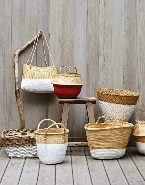 Además de adornar con algún elemento decorativo los capazos también podemos pintarlos con la técnica dip dyed. Es decir podemos sumergirlos en pintura a media altura y dejar secar. Con esta sencilla operación podemos conseguir un resultado tan atractivo como el de las imágenes. El paso a paso lo puedes ver en Martha Stewart.