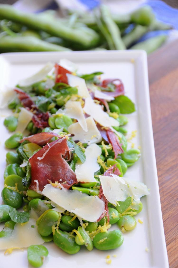 Pon una olla con la mitad de agua a hervir. Luego hecha las habas sin cáscara y deja hervir durante 20 minutos. En un tazón grande combina las habas hervidas con la ralladura de limón y las hojas de menta. Añade un chorrito de aceite de oliva y el jugo de limón por encima, junto con un poco de sal marina y pimienta. Añade a la ensalada el jamón serrano y dale un último toque con un poco de queso parmesano rallado en la parte superior.