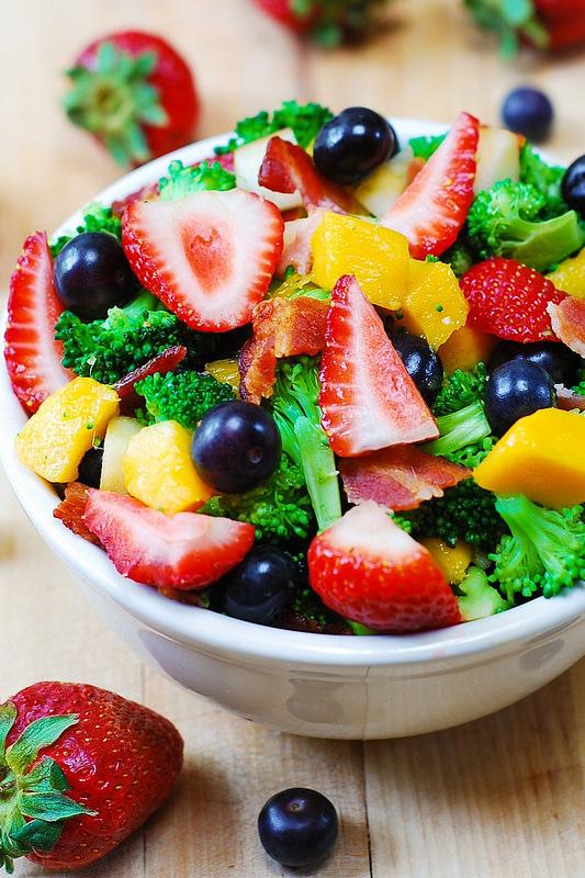 2- Ensalada de brócoli con fresas, mango y bacon.