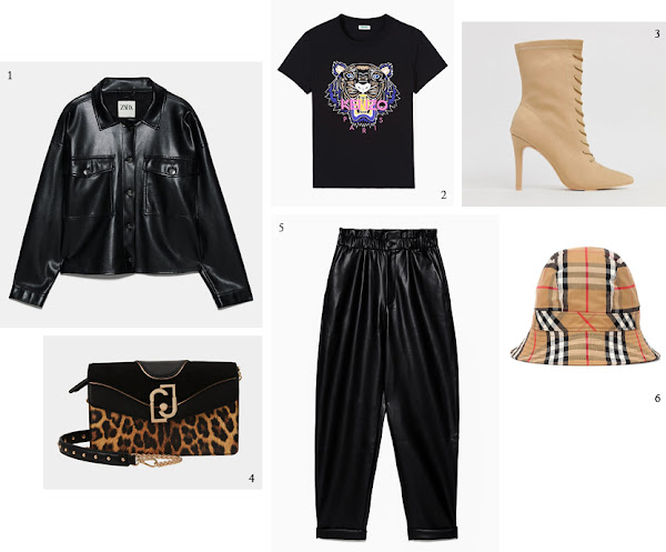 En orden: Sobrecamisa efecto piel, Zara (29.95€) Camiseta bordada, Kenzo (90.00€) Botines beige, Missguided (45.99€) Bolso estampado de leopardo, LIU JO (139.95€) Pantalones efecto piel, Zara (25.95€) Gorro de pescador, Burberry (270.00€)