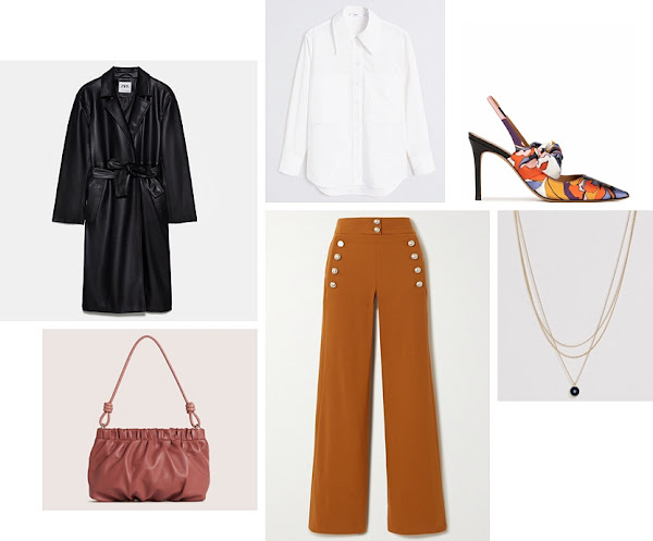 Camisa blanca, Mango (29.99€) Gabardina efecto piel, Zara (49.95€) Pantalones con botones, Chloé (990.00€) Bolso de piel, Malababa (550.00€) Salones destalonados, Pura López (250.00€) Collar de filas, ASOS Design (07.99€)