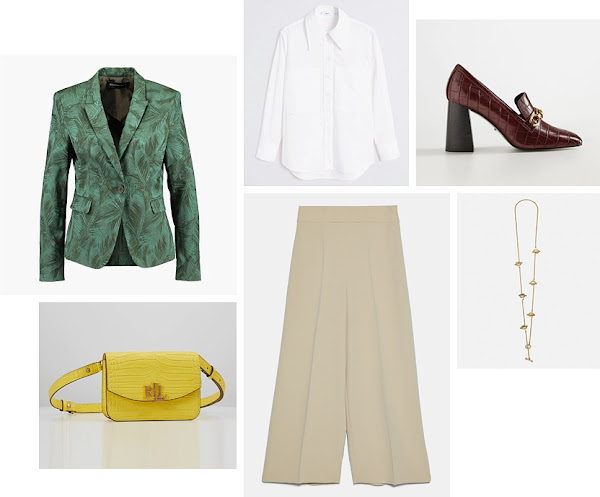 Camisa blanca, Mango (29.99€) Blazer estampado, Expresso (143.95€) Pantalones anchos, Zara (29.95€) Riñonera con textura, Lauren Ralph Lauren (114.95€) Collar con bridas, Victoria Beckham (340.00€)
