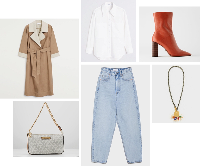 Camisa blanca, Mango (29.99€) Gabardina marrón, Mango (119.99€) Pantalones de tiro alto, Zara (25.95€) Bolso con logotipo, MICHAEL Michael Kors (109.95€) Botines de piel, Zara (79.95€) Collar de rafia y metal, Bimba y Lola (58.00€)