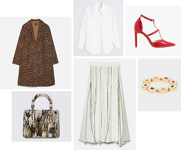 Camisa blanca, Mango (29.99€) Abrigo de leopardo, Zara (29.95€) Falda de tablas, Uterqüe (99.00€) Bolso bordado, Dior (5200.00€) Salones de charol, Even & Odd (34.95€) Pulsera geométrica, Parfois (07.99€)