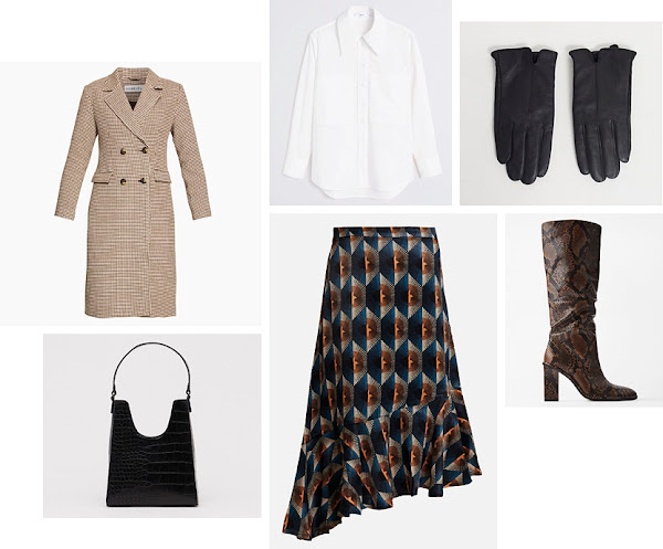 Camisa blanca, Mango (29.99€) Abrigo doble botonadura, Ivyrevel (147.95€) Falda asimétrica, Soyaconcept (55.99€) Bolso con textura, Sfera (17.99€) Guantes de piel, Accesorize (27.99€) Botas de pitón, Zara (39.99€)