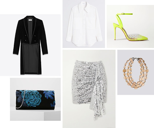 Camisa blanca, Mango (29.99€) Americana asimétrica de terciopelo, YSL (4290.00€) Falda con lentejuelas, In the mood of love (345.00€) Clutch floral, Anna Field (19.99€) Sandalias joya, Christian Louboutin (895.00€) Collar placas, Zara (22.95€)