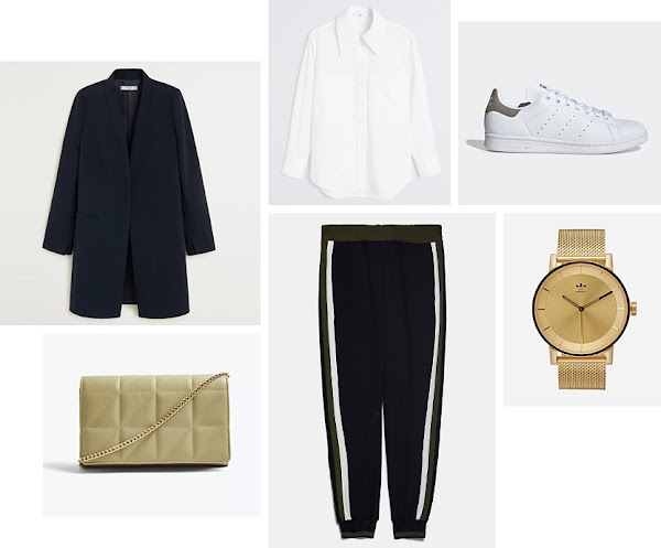 Camisa blanca, Mango (29.99€) Abrigo recto, Mango (59.99€) Pantalones jogger, Zara (19.95€) Bolso acolchado, Topshop (22.00€) Deportivas Stan Smith, Adidas Originals (99.95€) Reloj dorado, Adidas Originals (126.95€)
