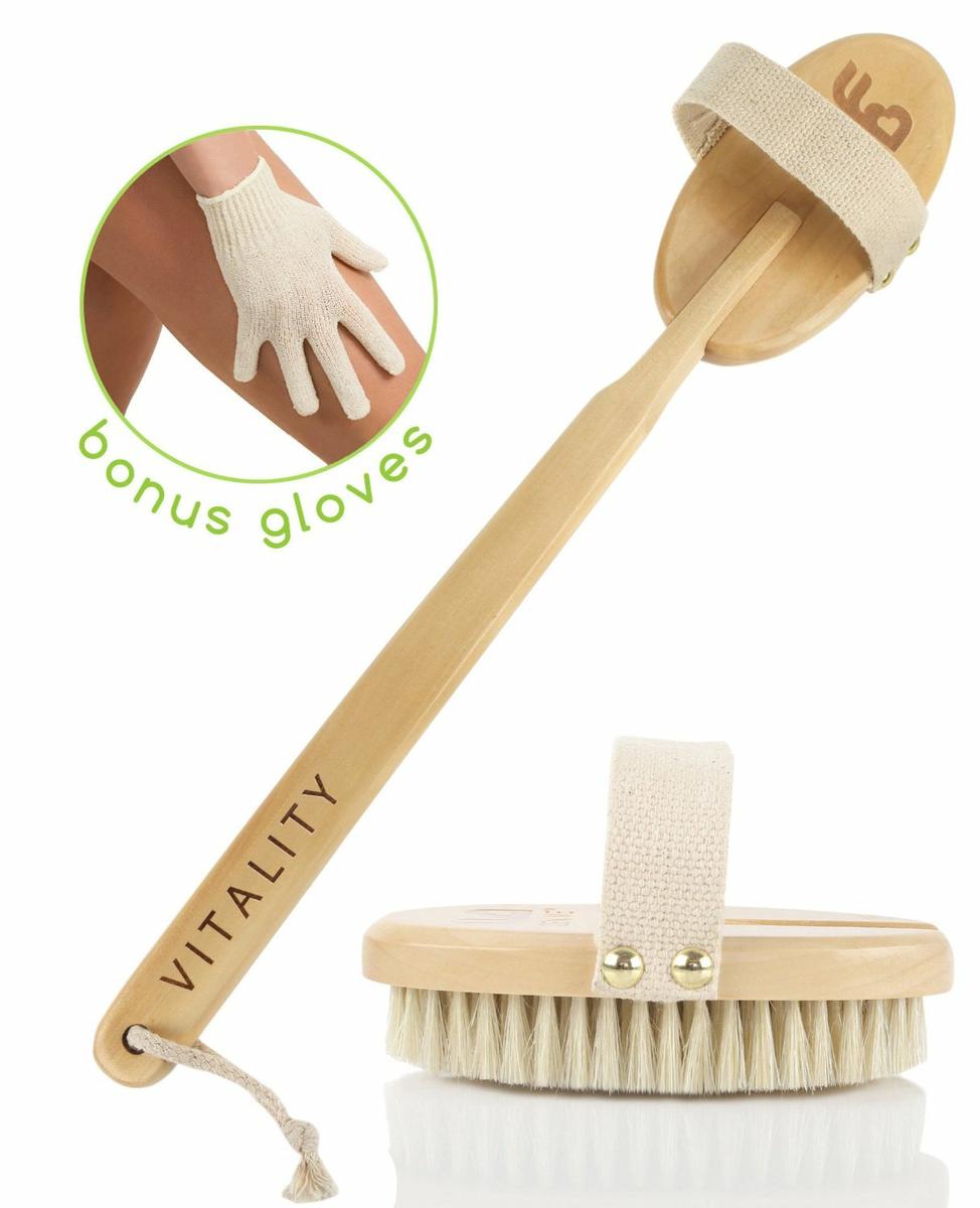 Beneficios: Además de que elimina toda la piel seca en áreas como rodillas, los codos y los tobillos, el cepillado del cuerpo promueve una piel más consistente, la renovación celular y el flujo sanguíneo. Esto también ayuda a la liberación de toxinas del sistema linfático y ayuda en la digestión y la función renal. También se dará cuenta de una piel más suave. Nos encanta porque es una de las cosas más fáciles, más baratas y más eficaces que podemos hacer para promover la salud de la piel “.