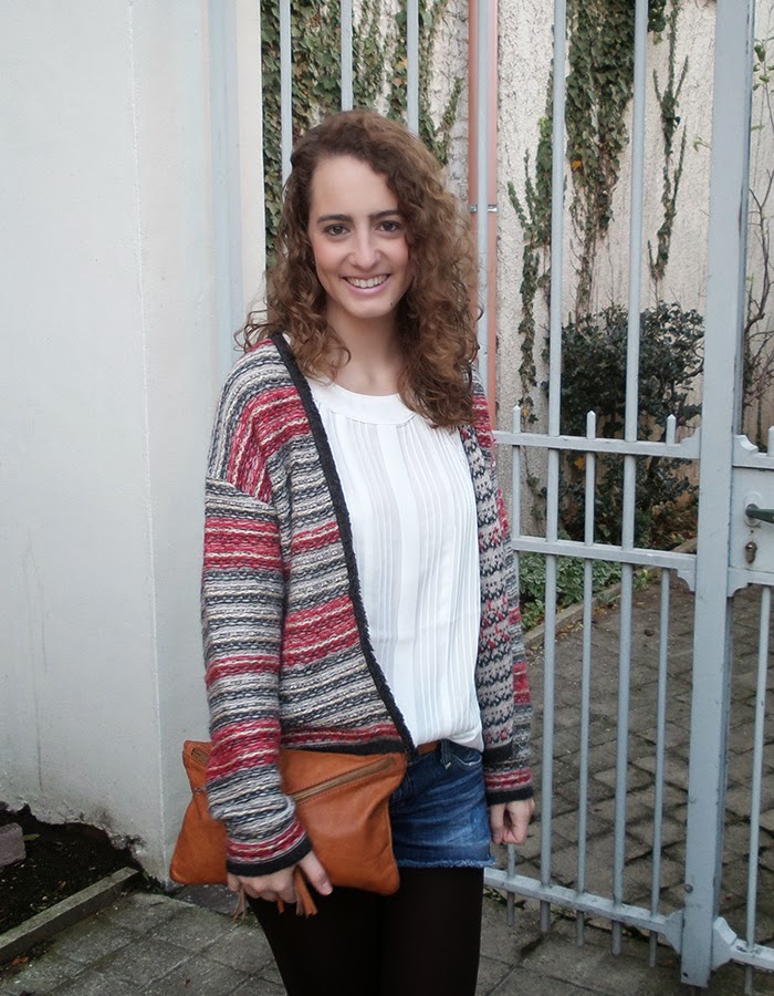 About today look,this cape you have already seen it combine in different ways like here or here, but this time I show you a more casual look mix with a denim shorts and a white top, the touch of color comes from the jacket with different shades of reds, grey and gold, and with the cognac from the belt and clutch.