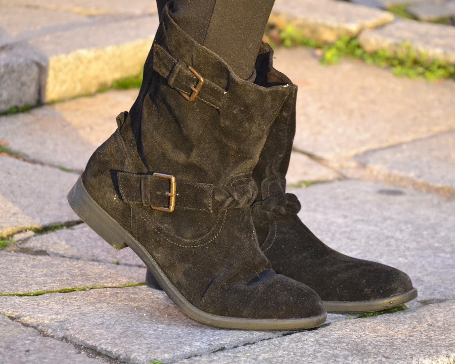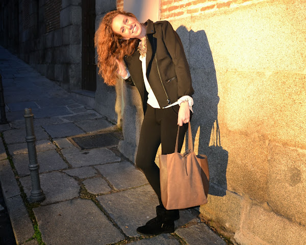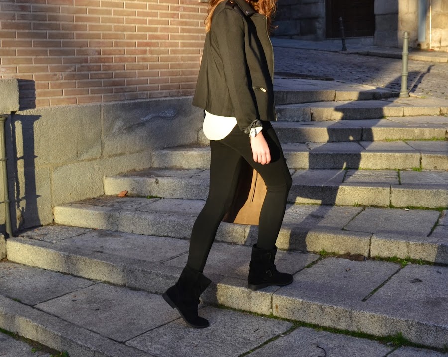 Ayer os enseñábamos un total look de Mulaya, y aquí va el segundo, aunque muy diferente. Miri escogió un look black & white, combinando unos jeggins negros comodísimos con una camisa de lunares muy femenina. Un outfit cómodo con unos botines planos de ante con hebillas y una chaqueta negra de neopreno muy de tendencia.