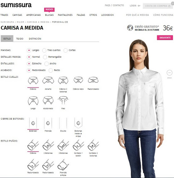 Además, como cuentan con más de 150 tejidos, imaginaos la cantidad de diseños que podemos crear... Hay más de 1.500.000 de opciones. Y por si esto fuera poco, la confección es a medida para que la prenda en cuestión nos siente como un guante y nos olvidemos de una vez por todas de las dichosas tallas (es como tener al sastre en casa, pero mucho más económico, claro... Jijiji). En mi caso, por ejemplo, como tengo los brazos muy largos, siempre me quedan las mangas de todas las camisas súper ajustadas y es u auténtico fastidio.