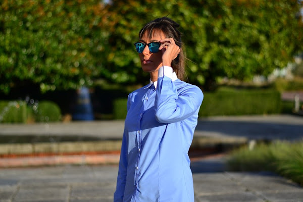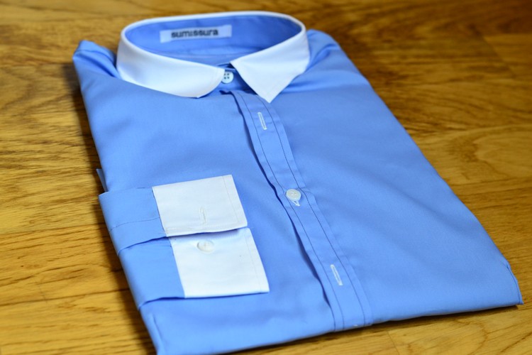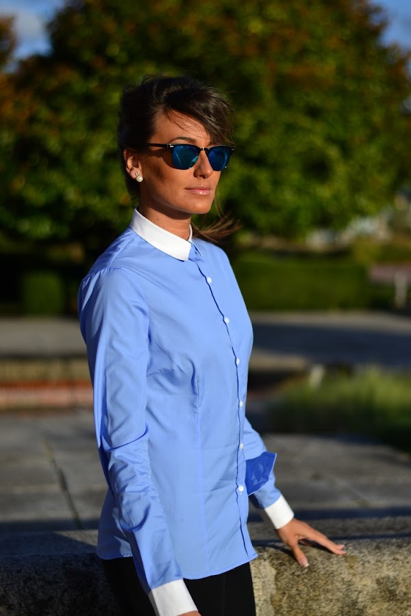 Mi particular apuesta: esta sencilla camisa de manga larga, entallada, con acabado redondeado, cuello clásico bajo y sin bolsillos, con un tejido 100% algodón de entretiempo, en tonos azules, exceptuando el exterior del cuello y los puños, que lo personalicé en blanco, así como los hilos y los ojales de los botones, también en blanco, para que contrastase.