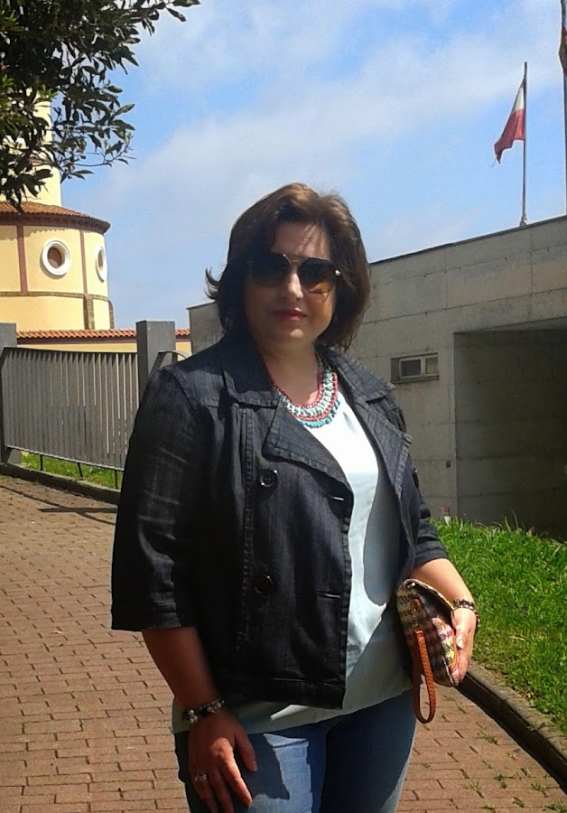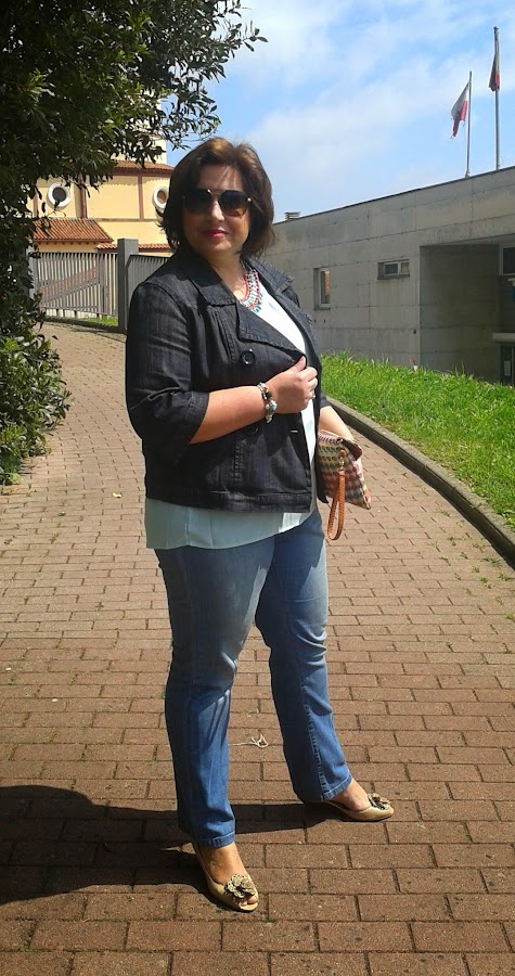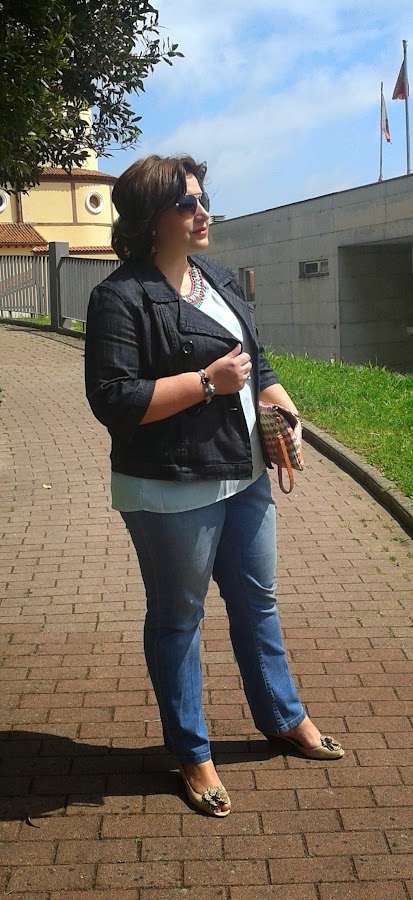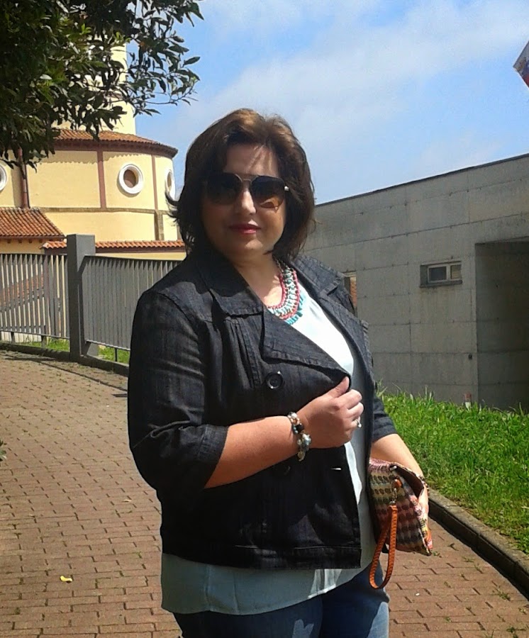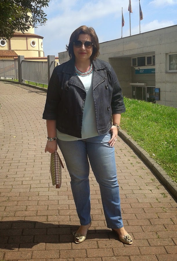 Combino el collar con una blusa color aguamarina, vaqueros claros y la chaqueta vaquera de manga francesa que ya os he enseñado en algún otro look.