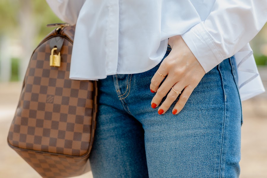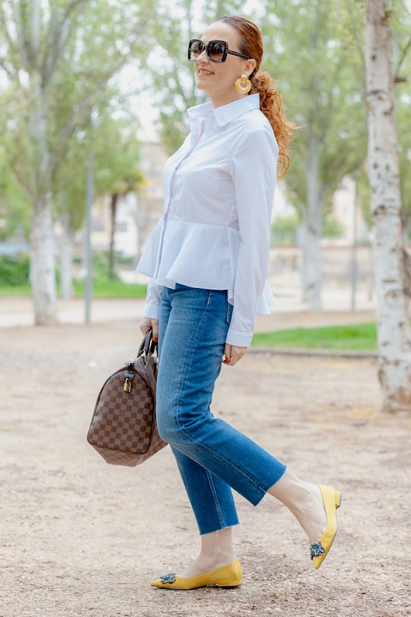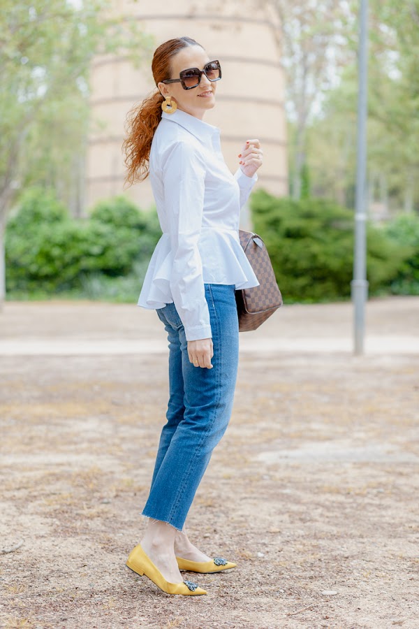 Muchos días, cuando tenemos que elegir la ropa que nos vamos a poner estamos ratos y ratos rompiéndonos la cabeza. Esos días yo suelo recurrir a los combos que se que nunca fallan, como el del look de hoy. Una camisa blanca siempre nos puede sacar de un apuro, por eso a mi me gusta tener unas cuantas con diferentes patrones, como esta peplum que es una monada. Son fáciles de combinar y quedan bien con todo, aunque yo siento debilidad por combinarlas con jeans como os enseño. Para cerrar el outfit unos pendientes bonitos y vistosos acompañados de unos zapatos joya y un bolso clásico que también es una apuesta segura con esta clase de looks.