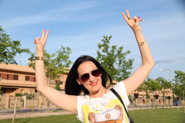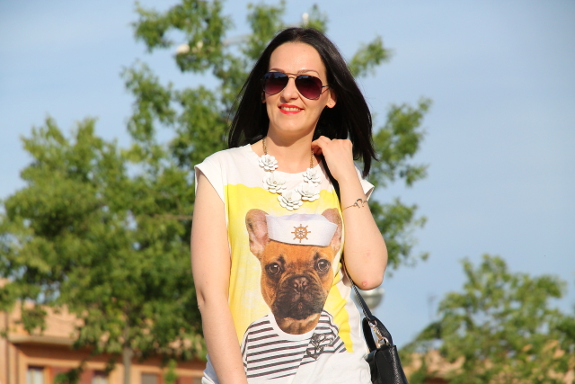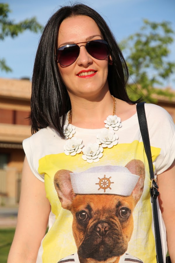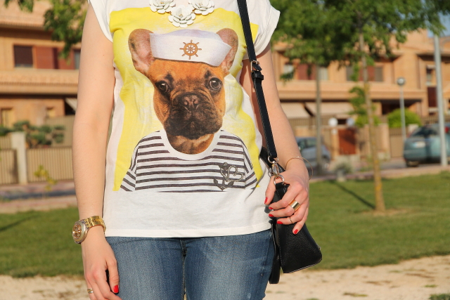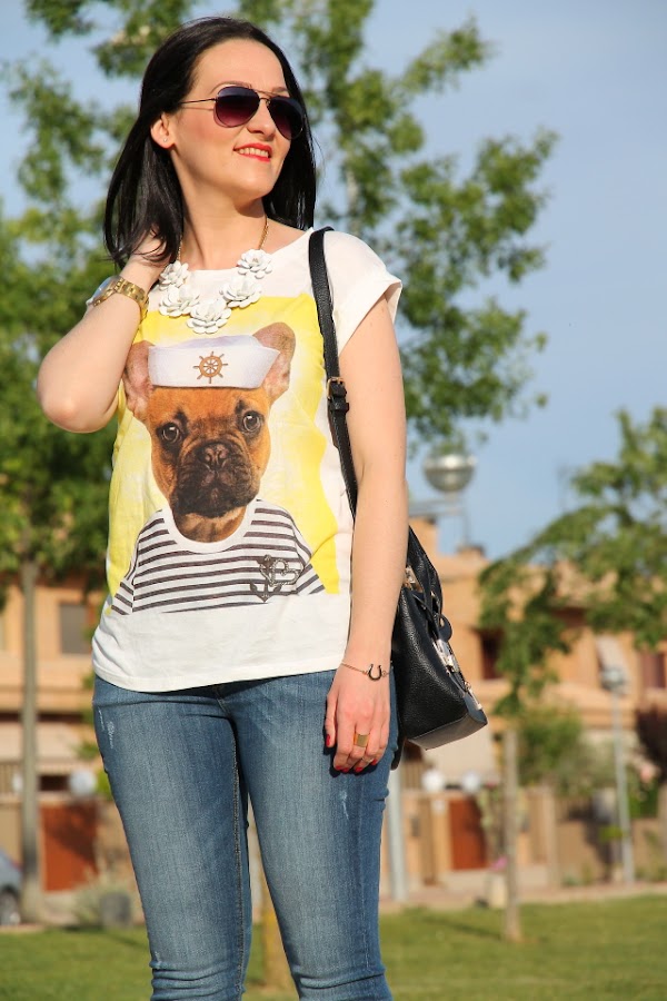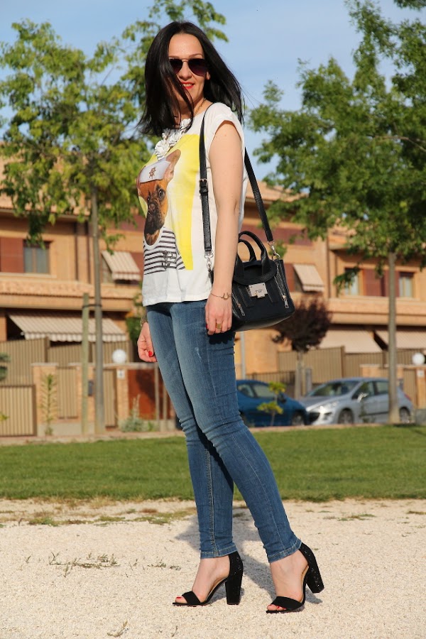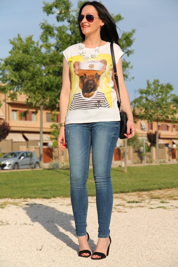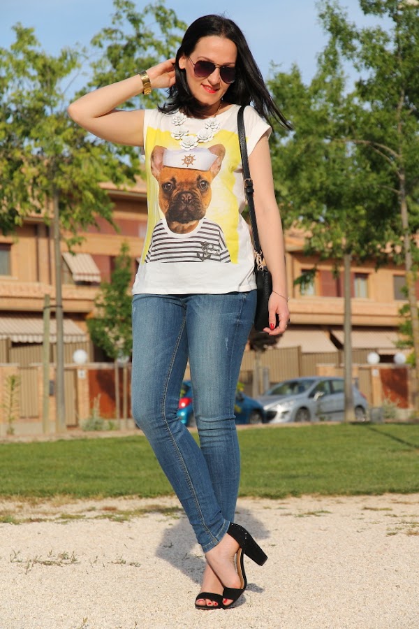 Como ya sabéis me encantan los perros, así que cuando vi esta camiseta me enamoré al instante de ella. Me resultó tan simpática con la foto del perro vestido de marinero que me la tuve que quedar si o si. Hoy la llevo con un outfit sin complicaciones gracias a mis jeans pitillo preferidos, la verdad es que sientan genial. Como este look me lo puse para salir a cenar con los amigos, decidí darle un toque más chic con las sandalias de strass y el collar de flores que casi se ha convertido en un básico de lo que me lo pongo.