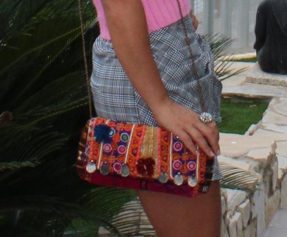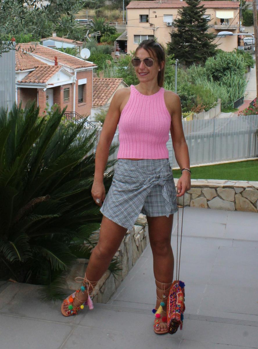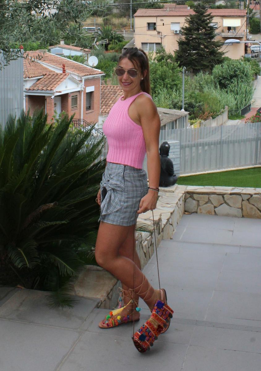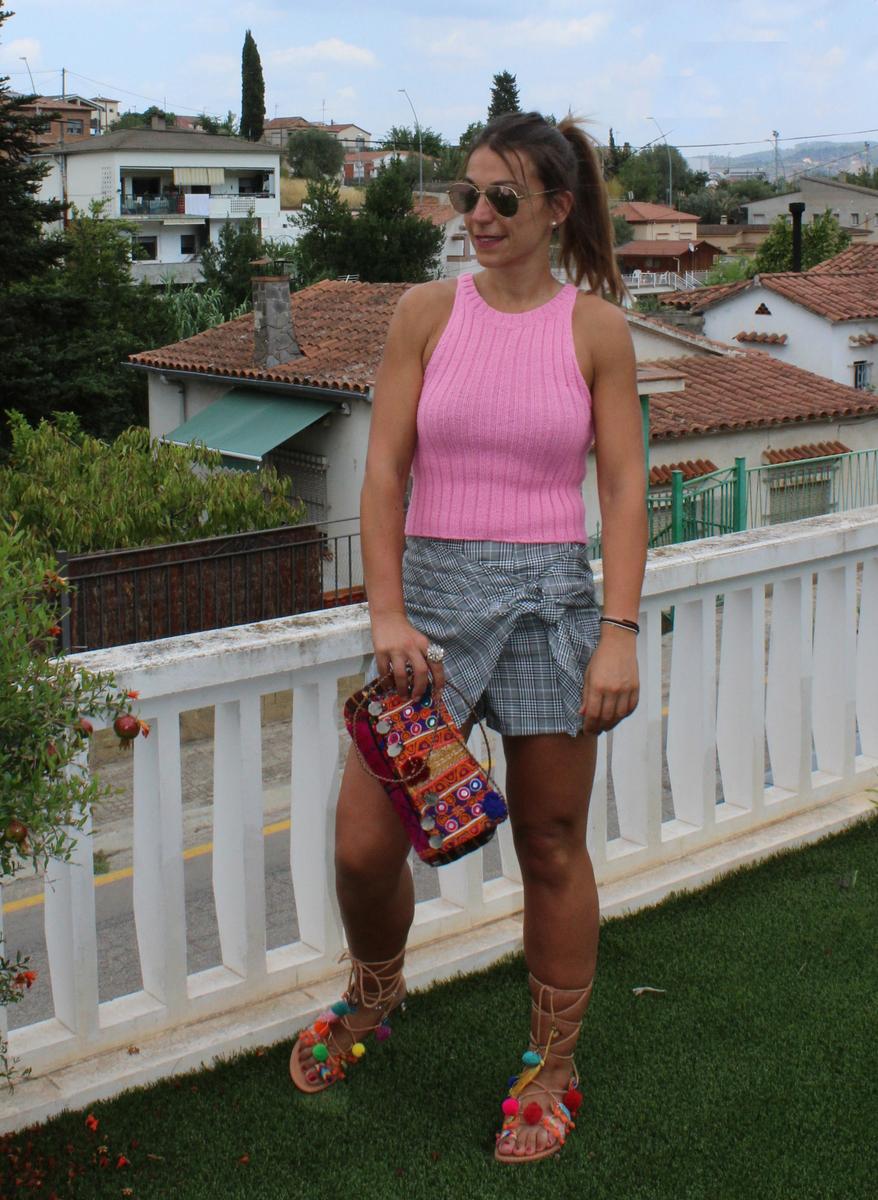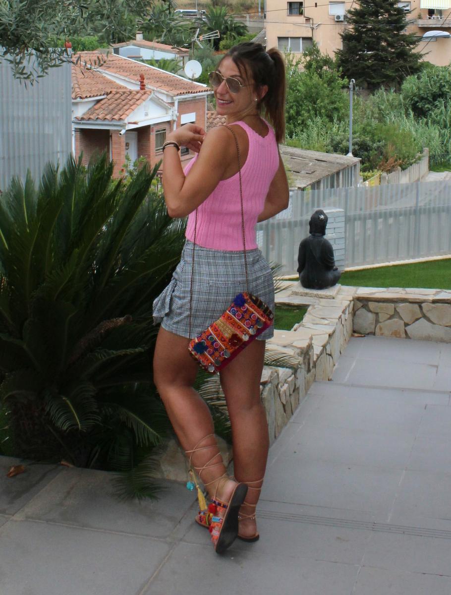 Para combinar mis cuadros escoceses he optado por combinarlo con colores veraniegos, un top en rosa y unas de mis sandalias preferidas, atadas a la pierna y llena de pompones y abalorios y siguiendo la linea del calzado, mi inseparable clutch banjara.