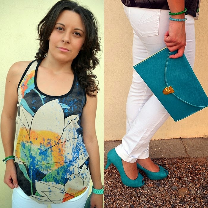 Holaaa!! Hoy os enseñó un look con otra de las camisetas de la colección Growing By Custo de Custo Barcelona para Lidl. A principio de mes os enseñé otro look (aquí). La camiseta que llevo me gusta porque se aprecia una flor con destellos en turquesa, y ya sabéis que a mi este color me encanta. No me gusta mucho como es la parte trasera porque es demasiado oscura para verano, pero como tiene el corte de una nadadora y la parte delantera tiene color...Como veis la he combinado con unos jeans blancos para darle todo el protagonismo a la camiseta y con complementos turquesa para mantener armonía en el outfit. ¿Os gusta la camiseta? ¿Cómo la combinaríais?