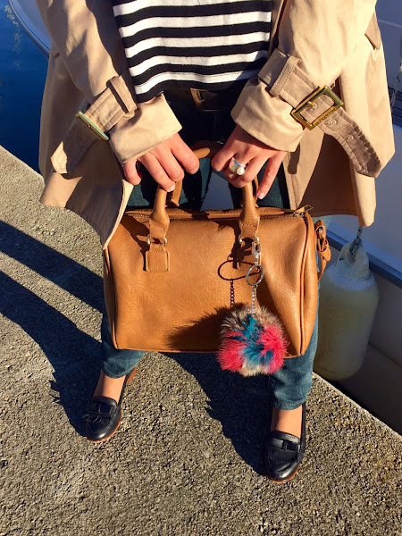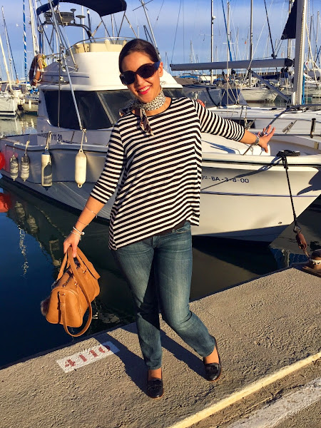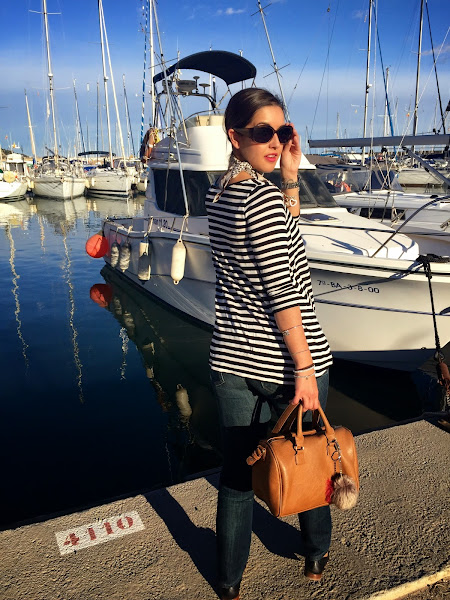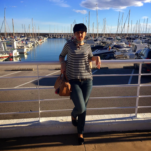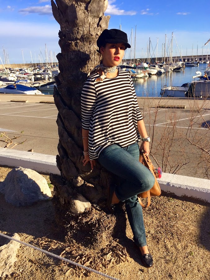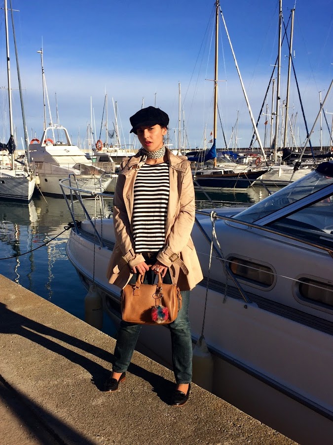 !Buenas noches amores! A un día de nuestro esperado fin de semana, después de una semana de intenso trabajo. ¡Qué ganitas de finde! Hoy os traigo un look primaveral, ya que parece que el frío nos empieza a abandonar y nos empiezan a acompañar temperaturas más suaves. El otro día fue a dar un paseo por el puerto, y elegí un look muy navy para la ocasión. En el look de hoy llevo tejanos, camiseta de rayas y trench beige. Como complementos elegí mi gorra que tengo desde hace años, un pañuelo al cuello, mis nuevos mocasines azules y mi inseparable bolso beige.