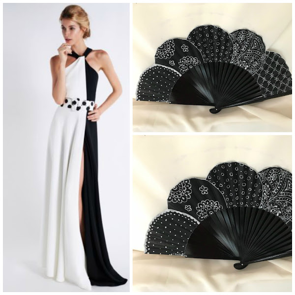 Siempre elegante,siempre un acierto el Abanico con varillaje negro lacado y el país pintado con dibujos blancos y toques plata que lo hacen único con los volúmenes y recortados,como único es el maravilloso vestido.