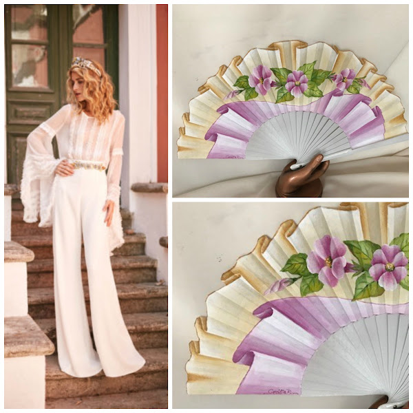 Abanico con varillaje lacado en blanco y volantes pintados en tonos pastel con estas flores de campanilla para un modelo moderno,romántico y atrevido como es este diseño de novia.