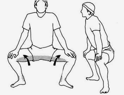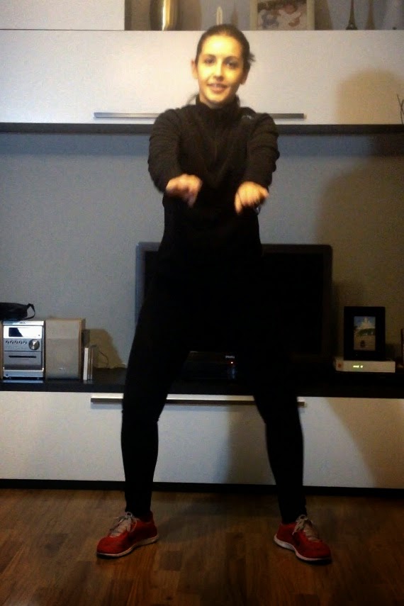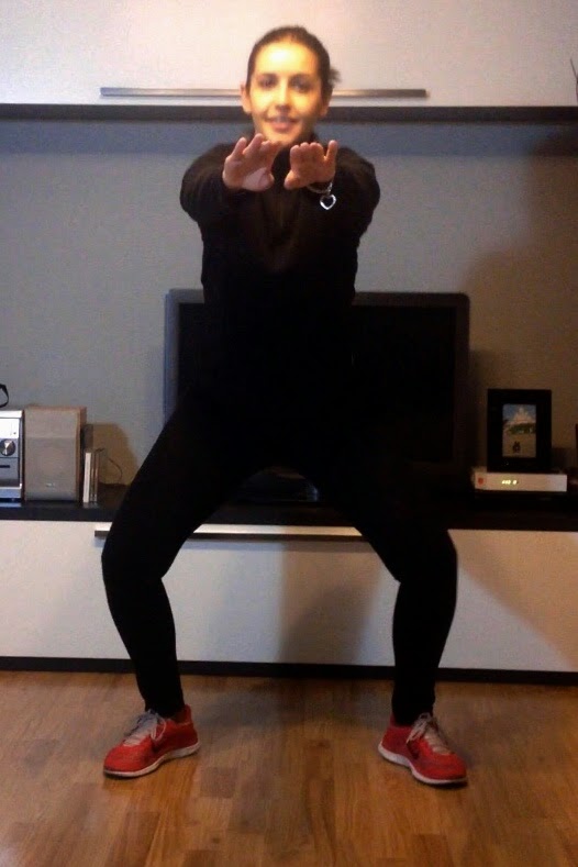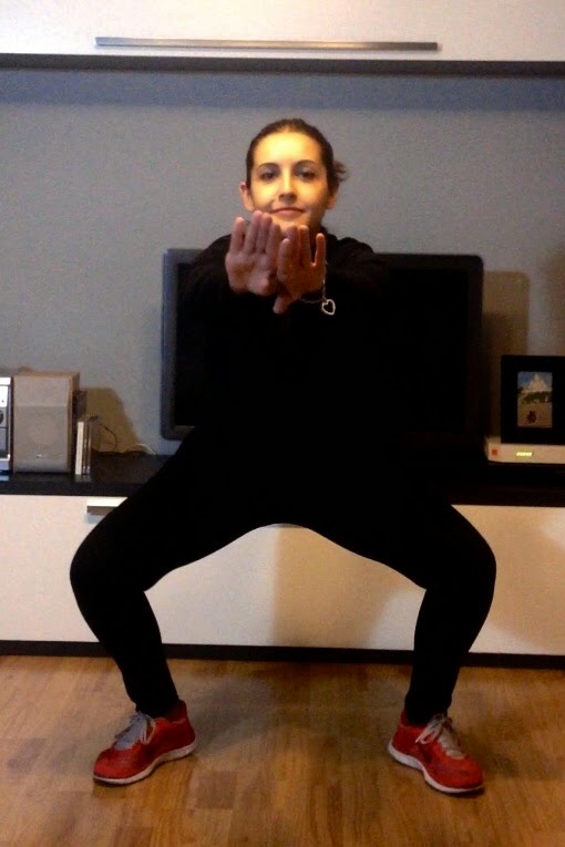 1. Sentadillas: nos colocamos como si fuéramos a hacer una sentadilla pero con las punta de los pies ligeramente abiertas hacia fuera, ya que así trabajamos además del gluteo, el abductor. Nos vamos a sentar haciendo un grado de 90 grados entre la pierna y la rodilla. Tal y como podéis ver en estas fotos: