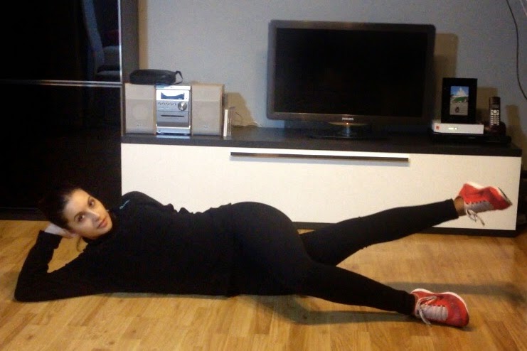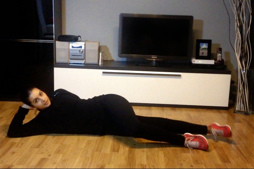 2. Elevación pierna: Nos acostamos de lateral, y flexionamos la pierna que queda encima, echándola un poco hacia delante. La pierna que queda debajo vamos a hacer elevaciones. Tal y como os muestro en la foto: