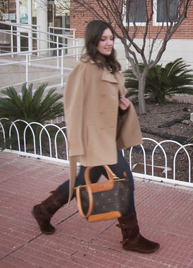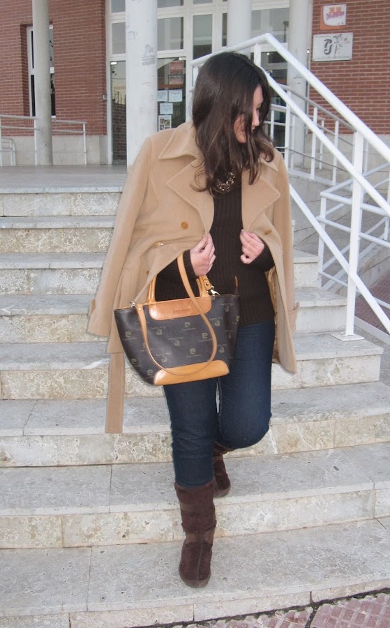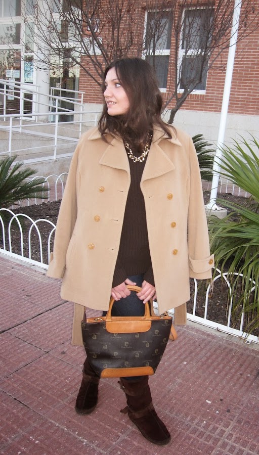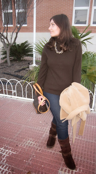 Para hoy un look cómodo y calentito, y es que en invierno voy súper abrigada!! No sé que tiene este jersey, pero me encanta y le estoy sacando mucho partido (creo que por lo calentito que es). Como veis, es otro look con tonos marrones, pero es que en invierno son los que más me gustan porque hacen mucho juego y son elegantes. Estas botas son la mar de cómodas (y calientes también, tienen pelito por dentro), pero son de hace mil!! El resto del look muy sencillo, vaqueros y abrigo en tono marrón. Y como complementos, bolso marrón y collar dorado.