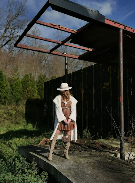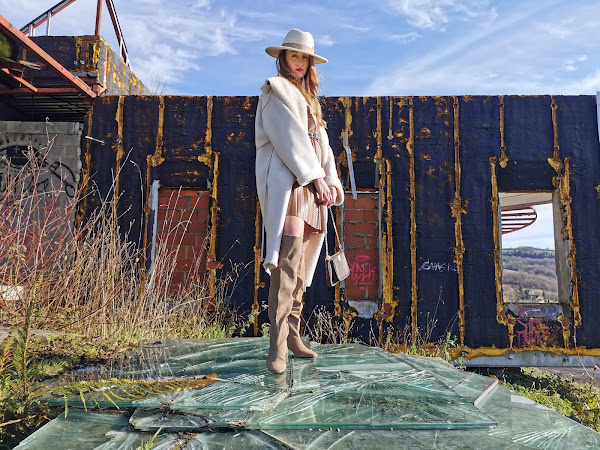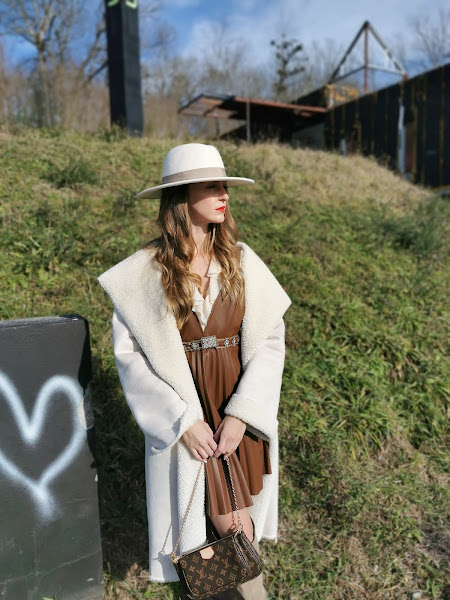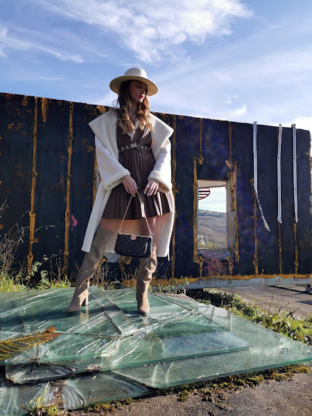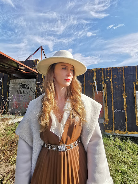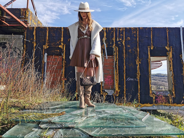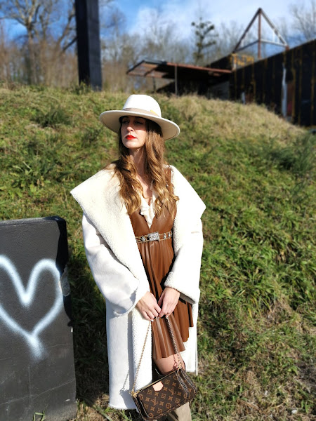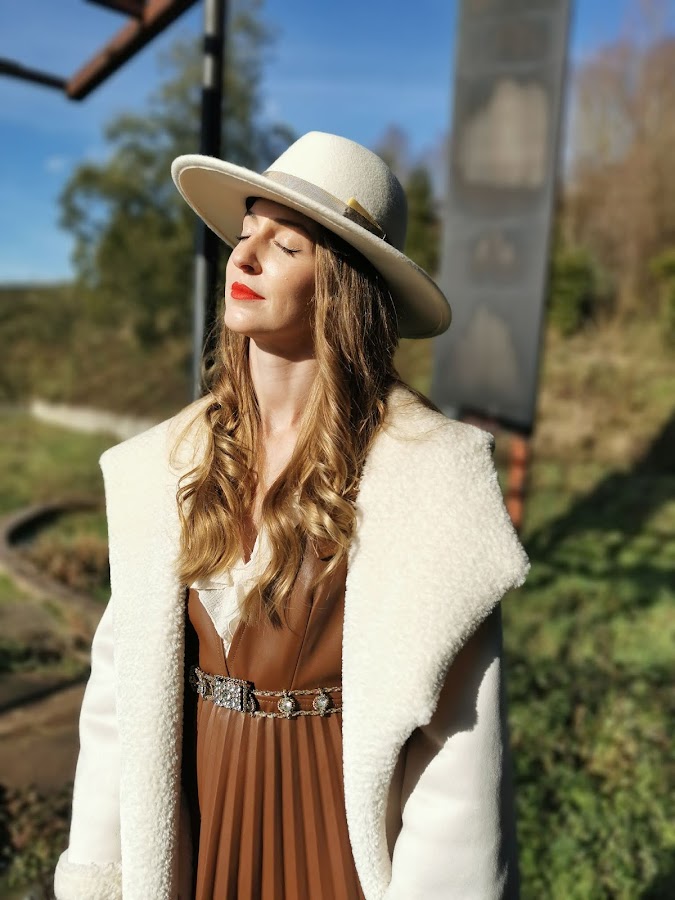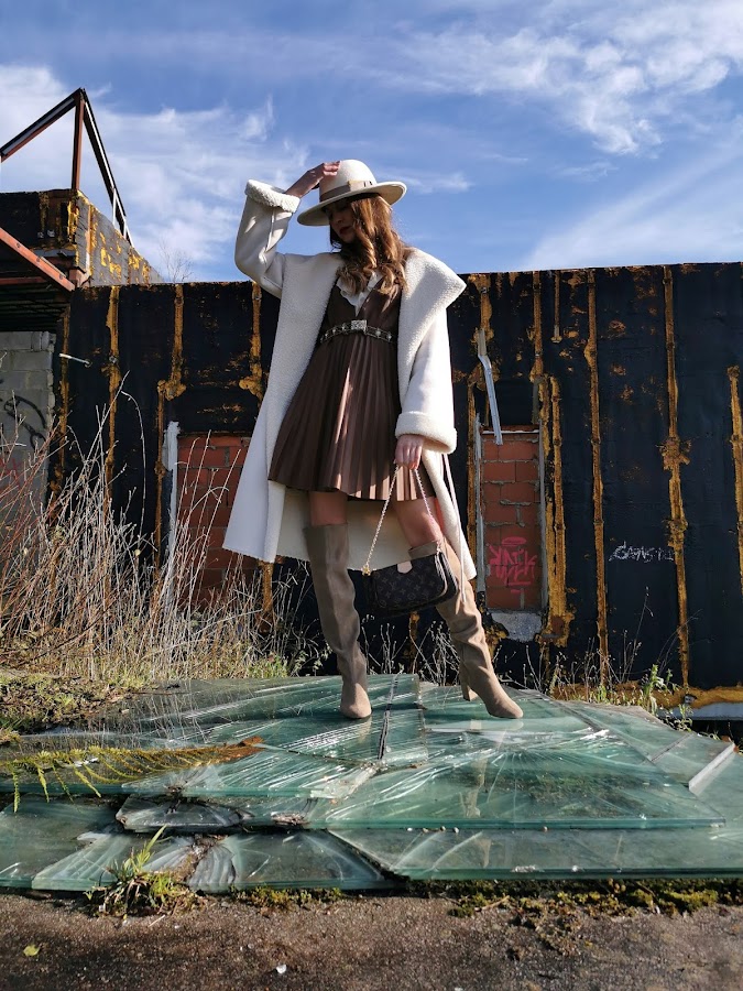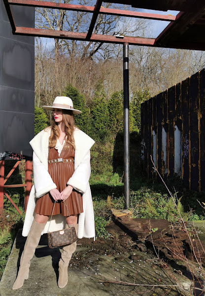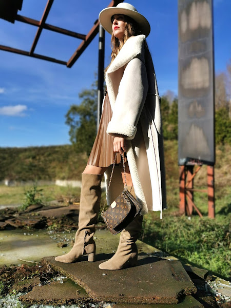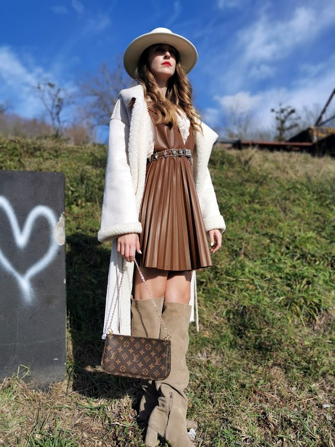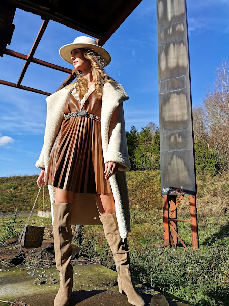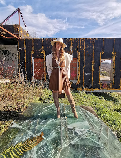 Un look arriesgado y diferente con una de las propuestas de nueva colección de Zara más originales que he visto que es este pichi de polipiel marrón y falda de tablas que me pareció precioso. Botas altas y sombrero siguen siendo tendencia esta temporada.