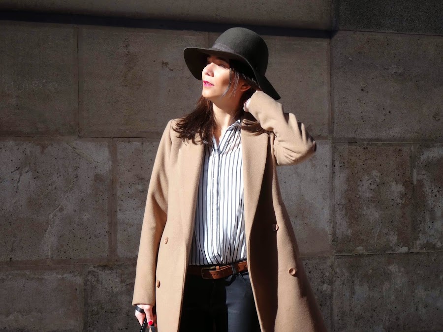 Arriba me puse esta camisa de rayas verticales blancas y negras que me parece muy favorecedora porque estiliza mucho la figura.