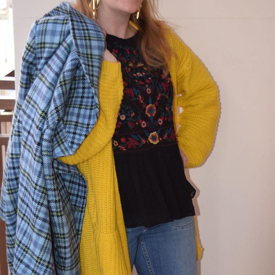 La idea es combinar los tonos menos predominantes en el abrigo con otra prenda que también destaque, en este caso la chaqueta de punto amarillo.