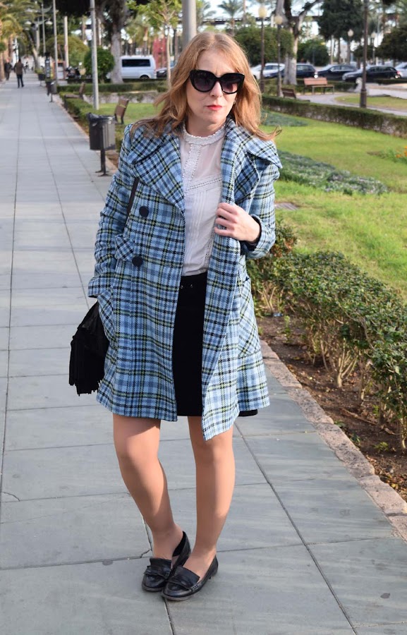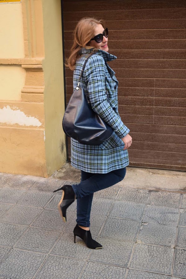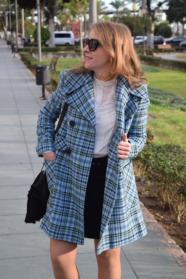 El protagonista, este abrigo de cuadros, que esta temporada arrasa como estampado preferido, en esta caso en colore azules más vivos, que alegran las mañanas más grises.