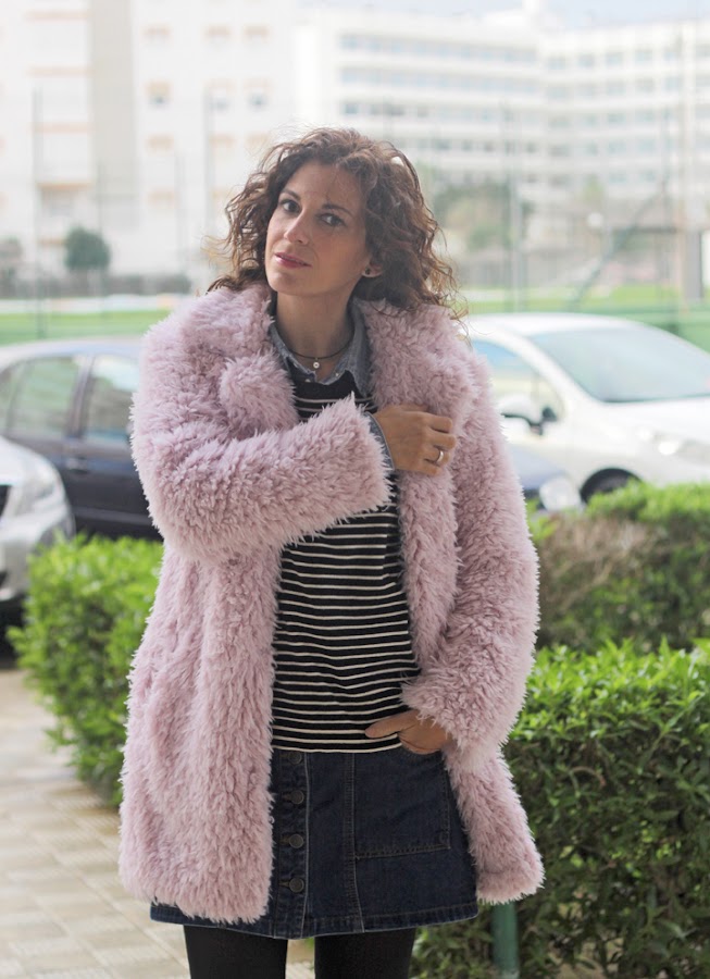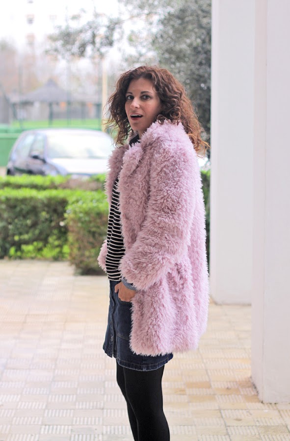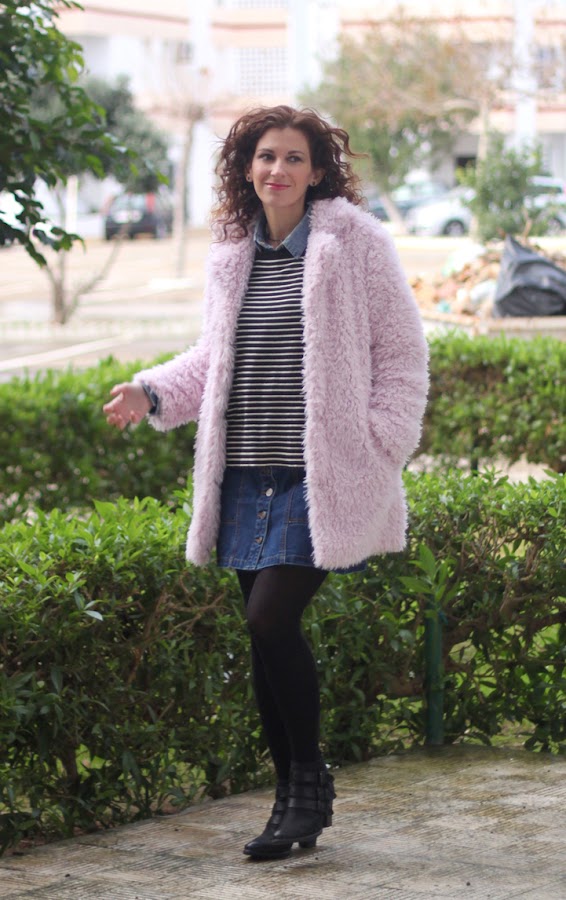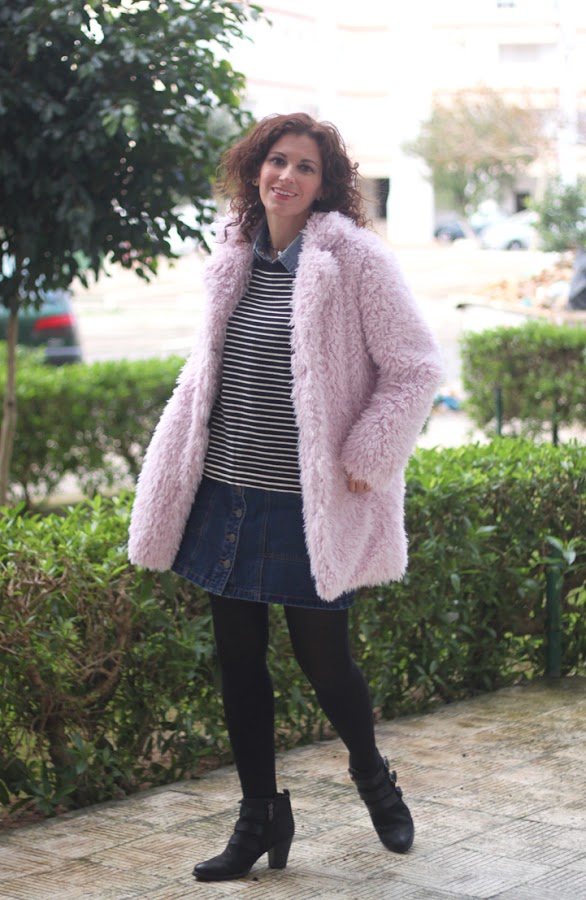 Tengo varios abrigos de pelo en mi armario pero este rosa es mi favorito, será por el color, ya sabéis que me encanta el rosa, pero en realidad también se debe a que es muy cómodo. Aunque es de pelo es muy amplio, no me aprieta en los brazos (odio los abrigos que aprietan y no dejan moverte) y me lo puedo poner incluso con los jerséis que son gorditos *_* En esta ocasión lo combiné con falda vaquera en forma de A y jersey a rayas, aunque me lo podéis ver también en este otro look totalmente distinto, ¿Os gusta el resultado? Ya estamos a mitad de semana ¡Feliz miércoles!