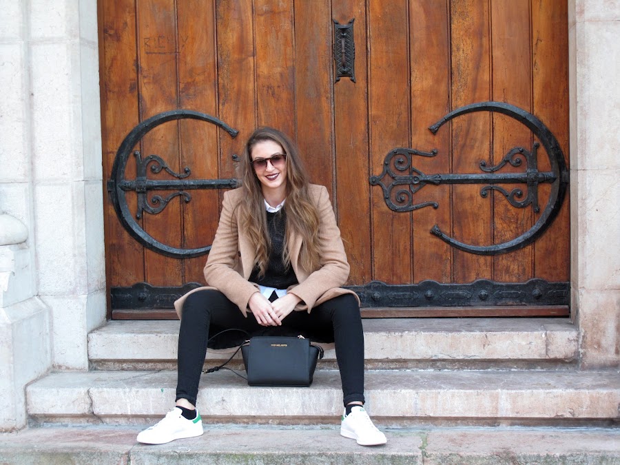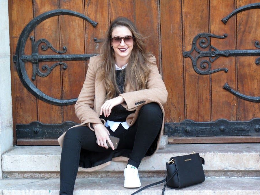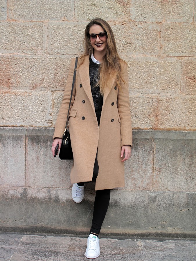 Para la visita elegí un look con abrigo camel oversize de Zara, prenda que ha sido un must have este invierno y que ha sido una buena inversión de rebajas, camisa blanca y jersey calado negro también de Zara del año pasado, pantalón skinny negro de Mango, deportivas Stan Smith de Adidas, mi regalo de reyes de este año bolso negro de Michael Kors y gafas de sol Mr. Boho.