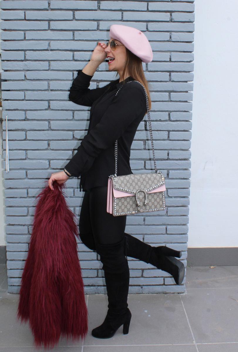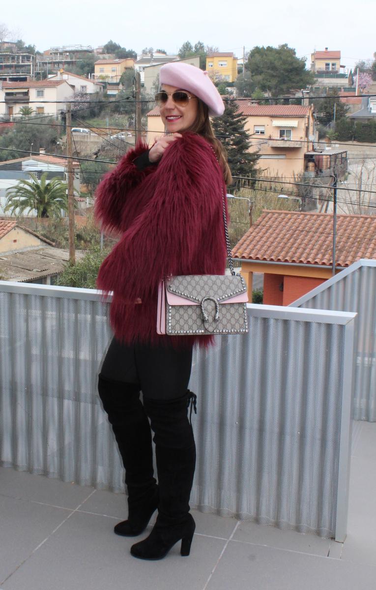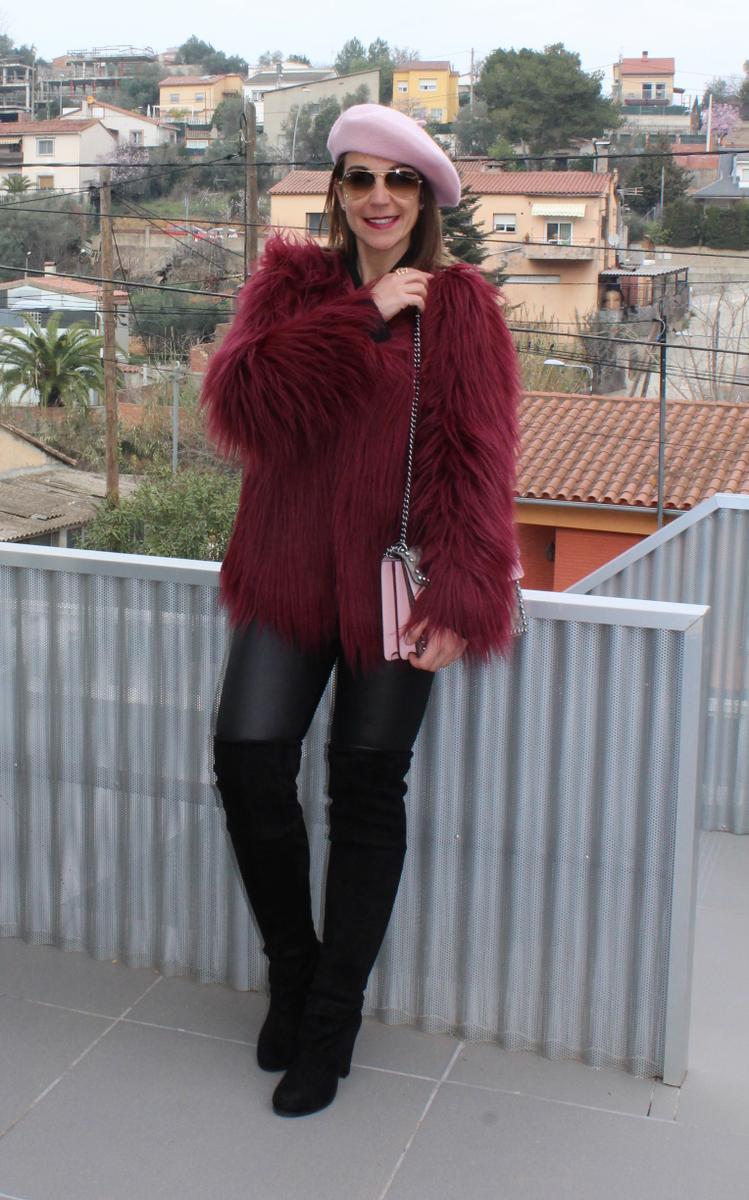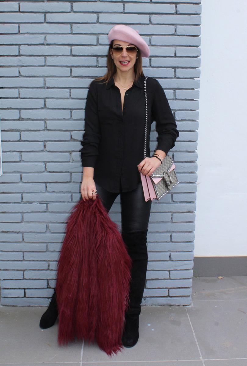 Para el primer look elegí uno de pelo largo en color burgundy, un abrigo que por si sólo ya crea cualquier look, por eso el resto de la prendas son en color negro y prendas básicas que todas tenemos en nuestro fondo de armario. Por un lado unos leggins encerados, camisa negra y botas overknee. El toque chic-parisino lo pone la boina en un color rosa bebe que contrasta con el color del abrigo, pero a la vez lo relaja y suaviza.