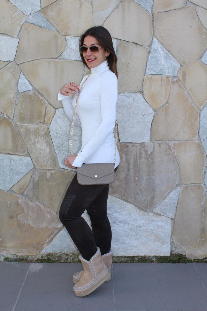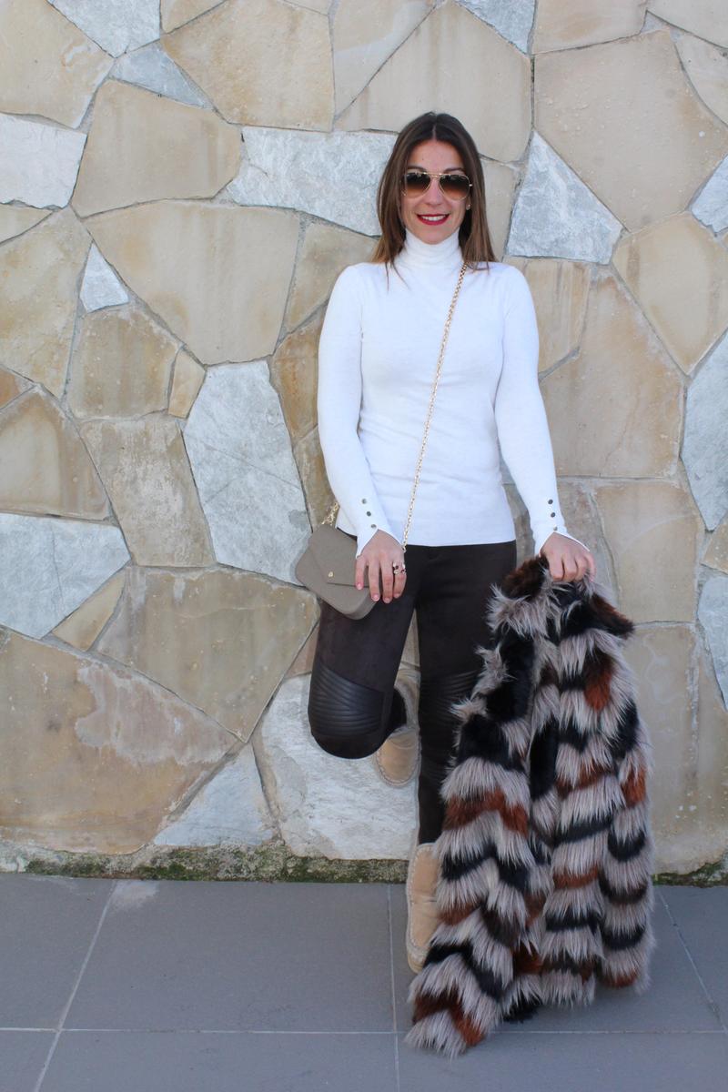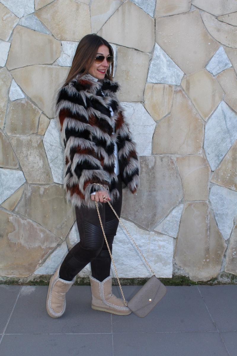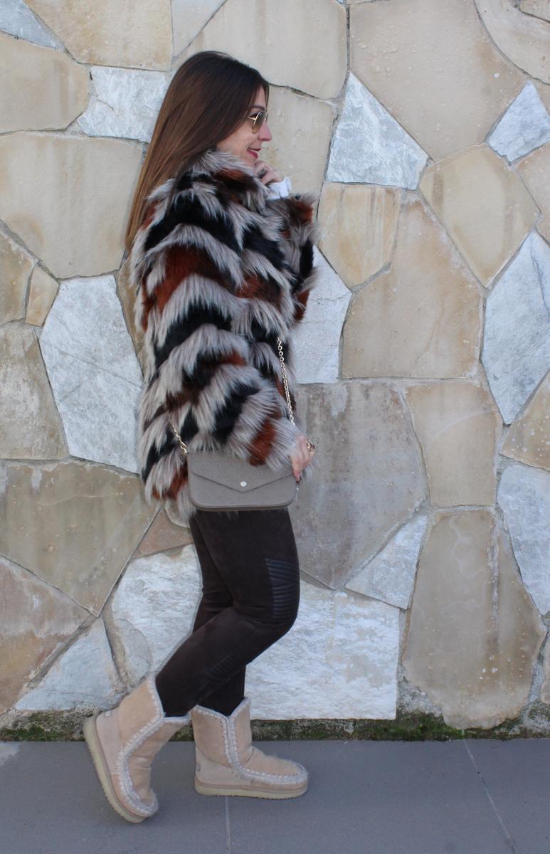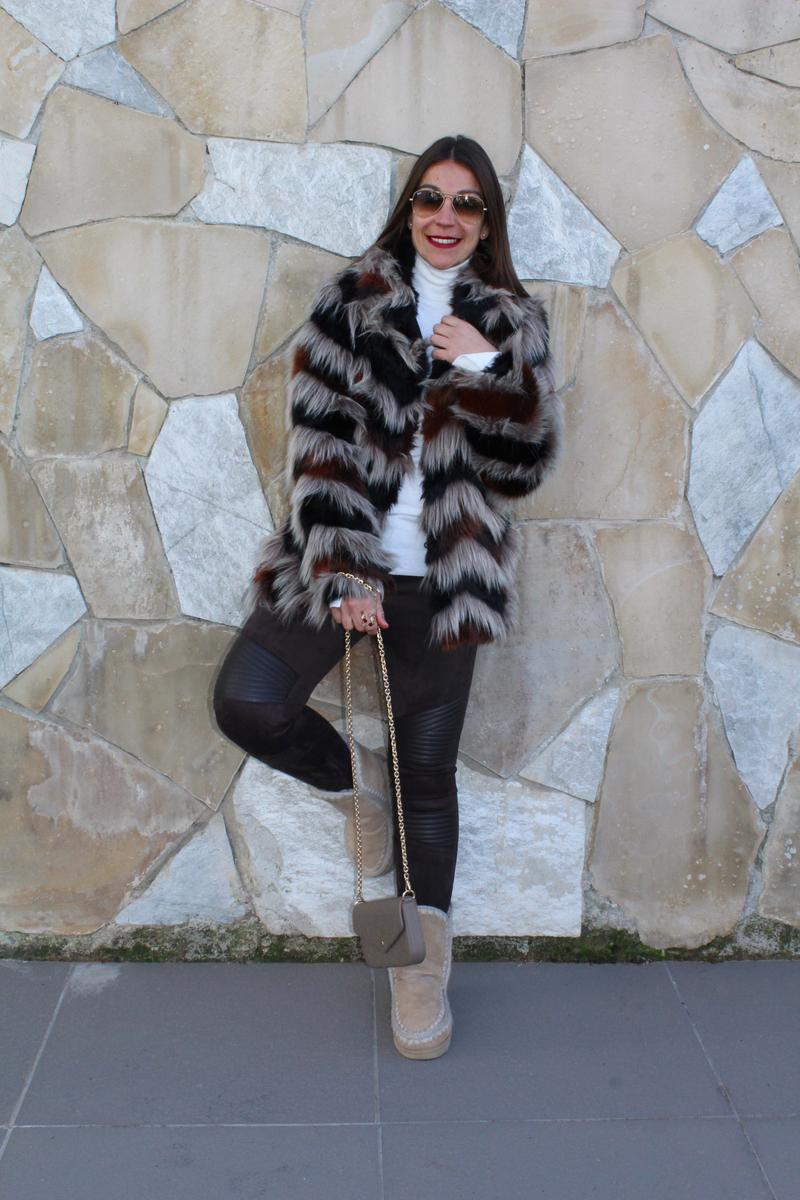 Para el ultimo look del pack, elegí un abrigo tricolor en tonos marrones y beige. Un abrigo muy bonito, ya que el pelo va haciendo espiga y le añade un toque diferente. Para completar el resto del outfit opté por pantalones de ante tipo biker, con las rodilleras en polipiel, jersey básico de cuello subido y como el día era muy , muy frío, y la jornada se presentaba muy ajetreada y primaba la comodidad, opté por botas de pelo, dotando al look de un aire muy sport.