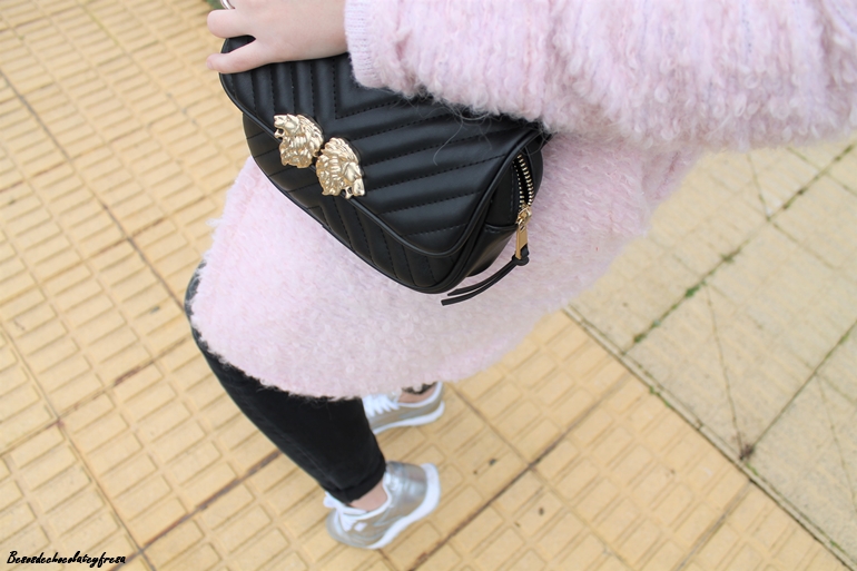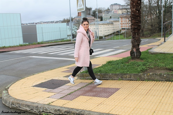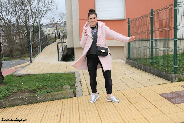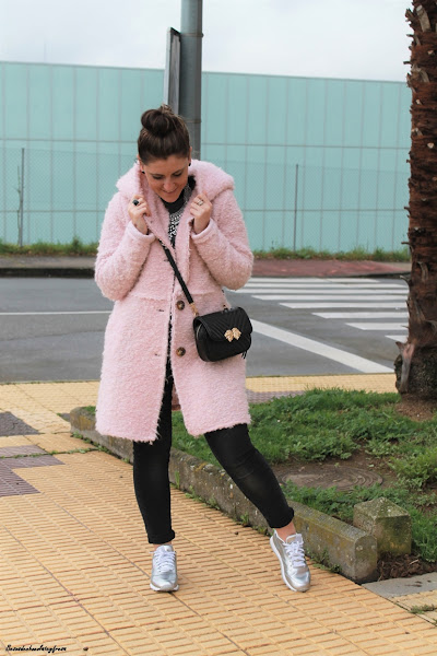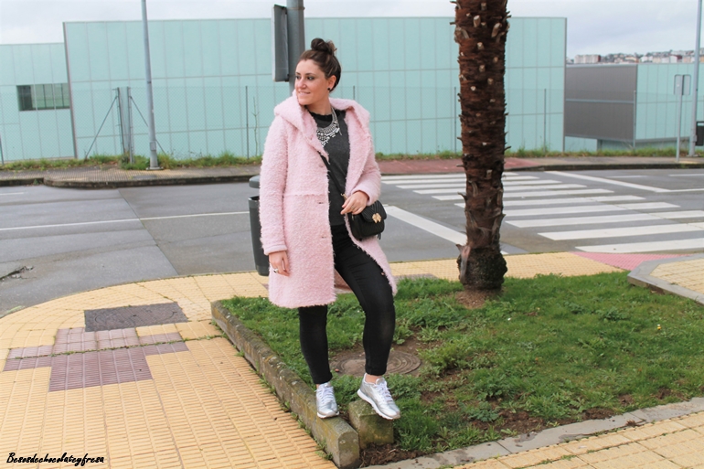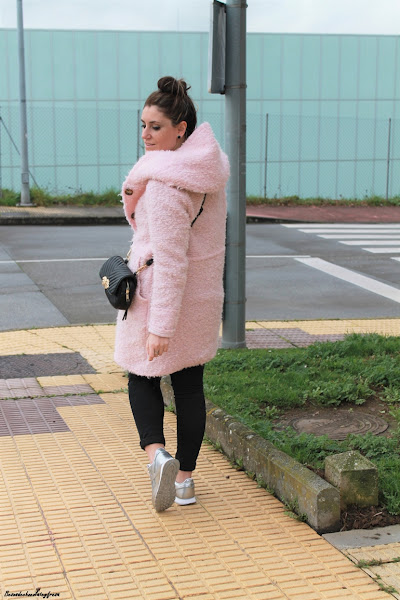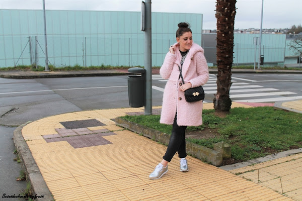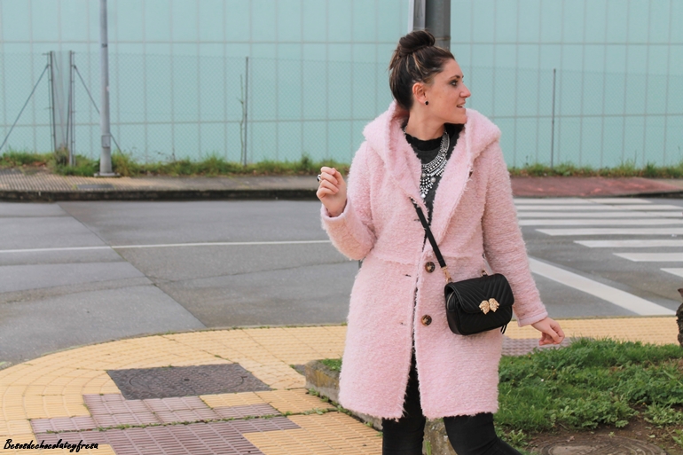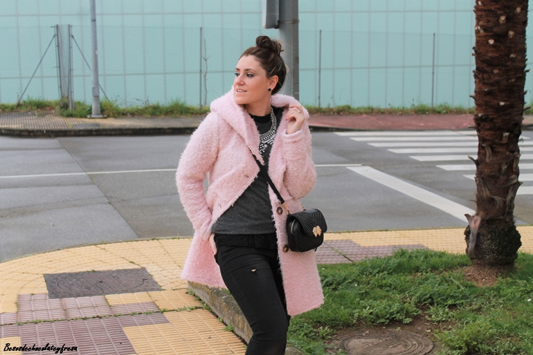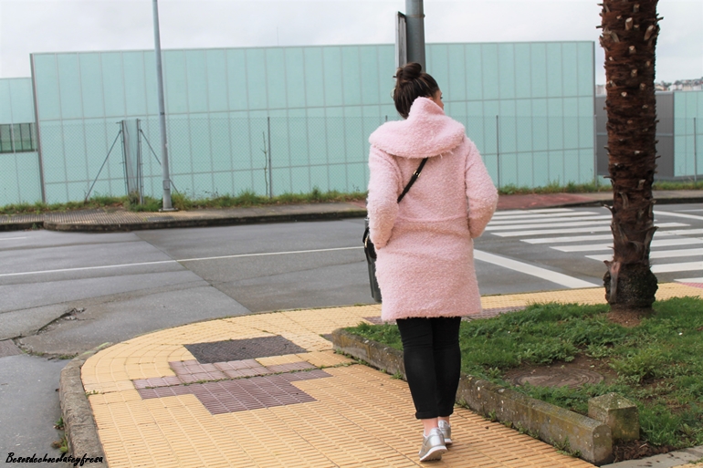 Se trata de un abrigo largo con capucha y de este tejido, el borreguillo, súper calentito para los días más fríos de invierno y chic, muy chic. Y como no, en el color estrella del momento, el rosa, en este caso en el rosa empolvado que en su conjunto parece como un algodón de azúcar de fresa, sacado de la feria. Un toque de dulzura para el outfit.