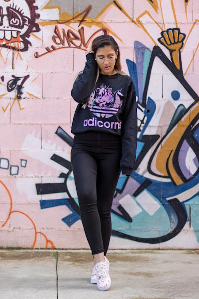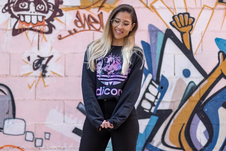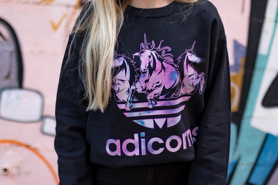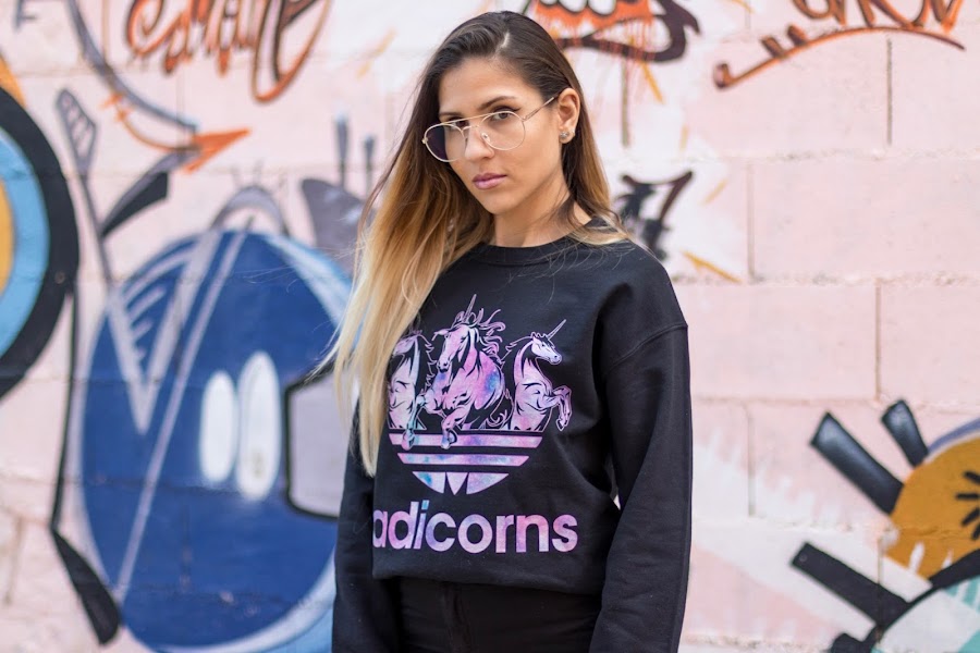 Es de TEECHIP, una tienda de sudaderas y camisetas súper molonas con estampados divertidos y originales. Ya sabéis que a mi me encantan los unicornios, y mi pareja que me conoce mejor que nadie también lo sabe, así que no pudo evitar comprarme la sudadera Adicorns, imitando el símbolo de la famosa marca con unos unicornios en tonos rosas y lilas.