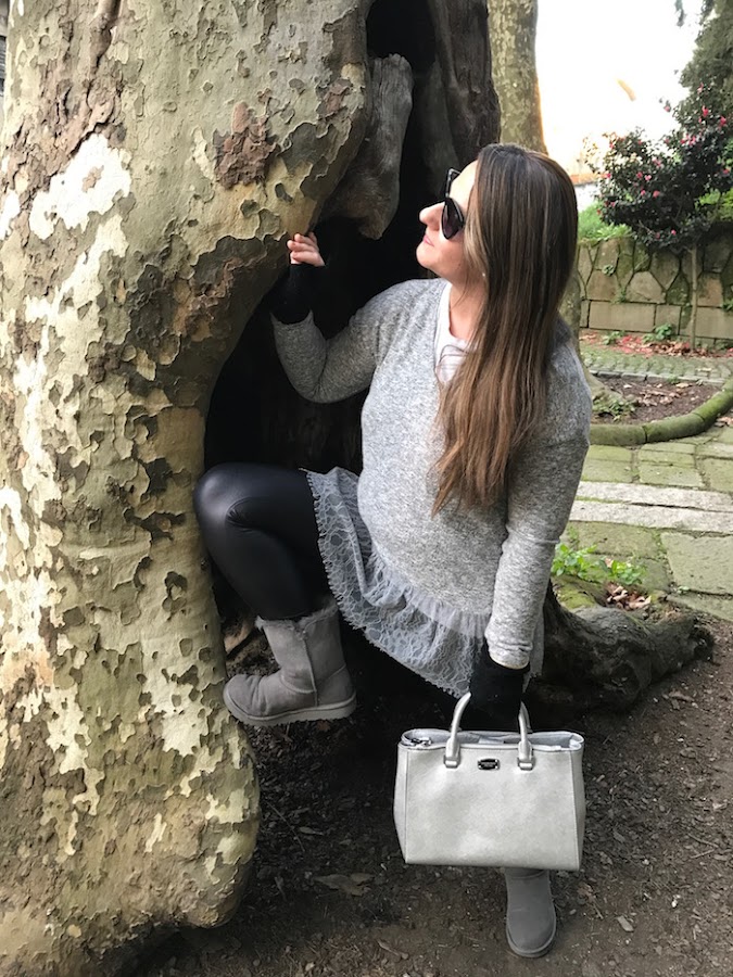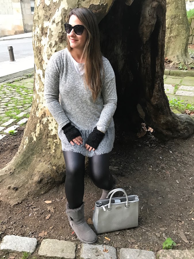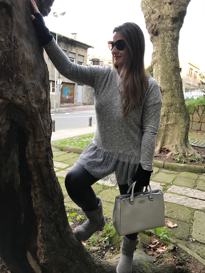 En este caso, mi outfit, es con jersey con puntilla en el bajo adoptando la tendencia ballet que tanto me gusta. Leggins efecto piel, que este año no me saco de encima porque son cómodos y calentitos y para terminar UGG traídas de mi viaje a Nueva York en color koala, como yo le llamo y bolso en plateado.