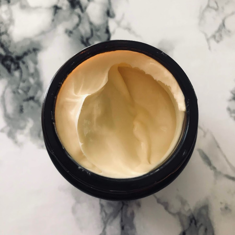 El packaging es un bote a rosca de cristal y el producto es de color amarillo algo denso que en contacto al friccionar en las manos se convierte en "aceitoso".