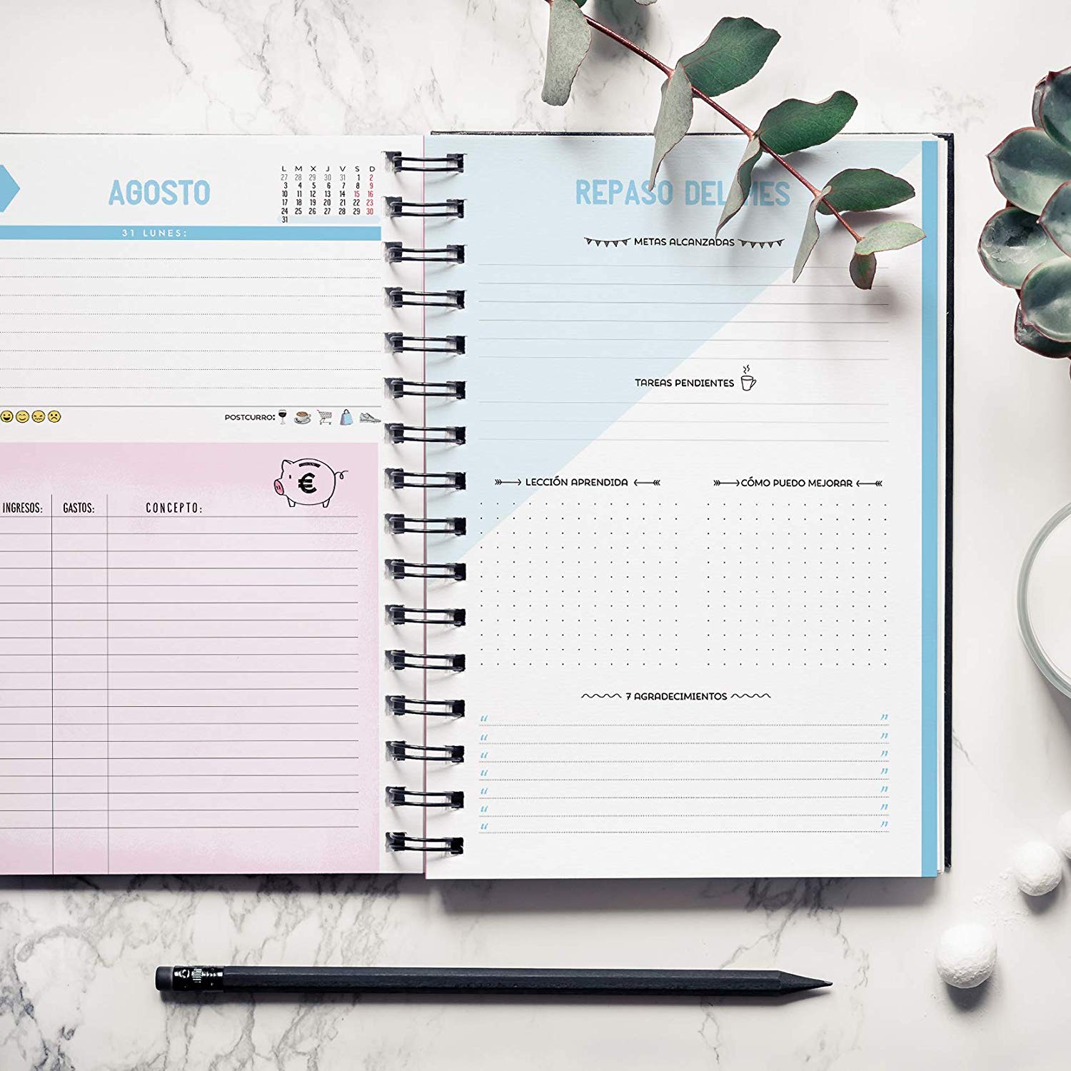 Esta agenda en concreto tiene una hoja para apuntar los gastos y los ingresos del mes, pegatinas, semana vista y calendario mensual. Además puedes escribir objetivos de mes y de semana. Muy completa, con stamping en oro en la cubierta. Tamaño A5 (15x21cm), marca desde Septiembre de 2019 a Agosto de 2020, por lo tanto es más una agenda escolar.