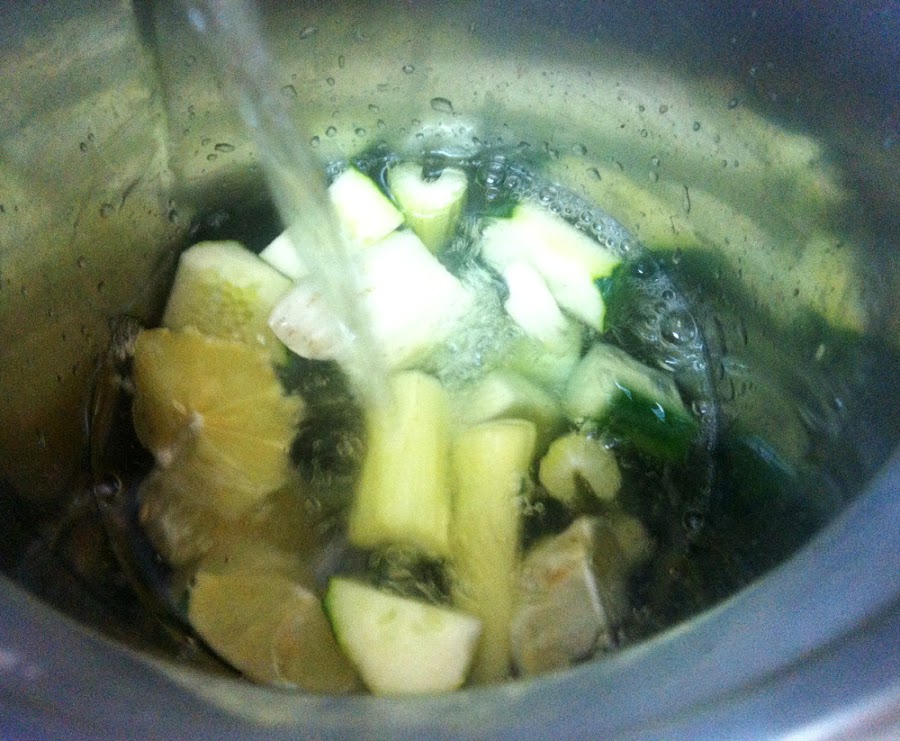 Introducir en el vaso de la Thermomix el apio y el pepino cortado en varios trozos.