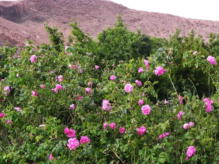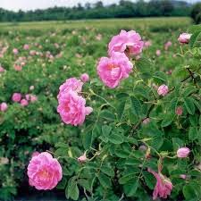 Pequeño arbusto espinoso con ojas de color verde-intenso y grandes flores rosas,el Rosal de Damasco es originario de Oriente (Siria);hoy se cultiva principalmente en Marruecos,Bulgaria y Turquía.